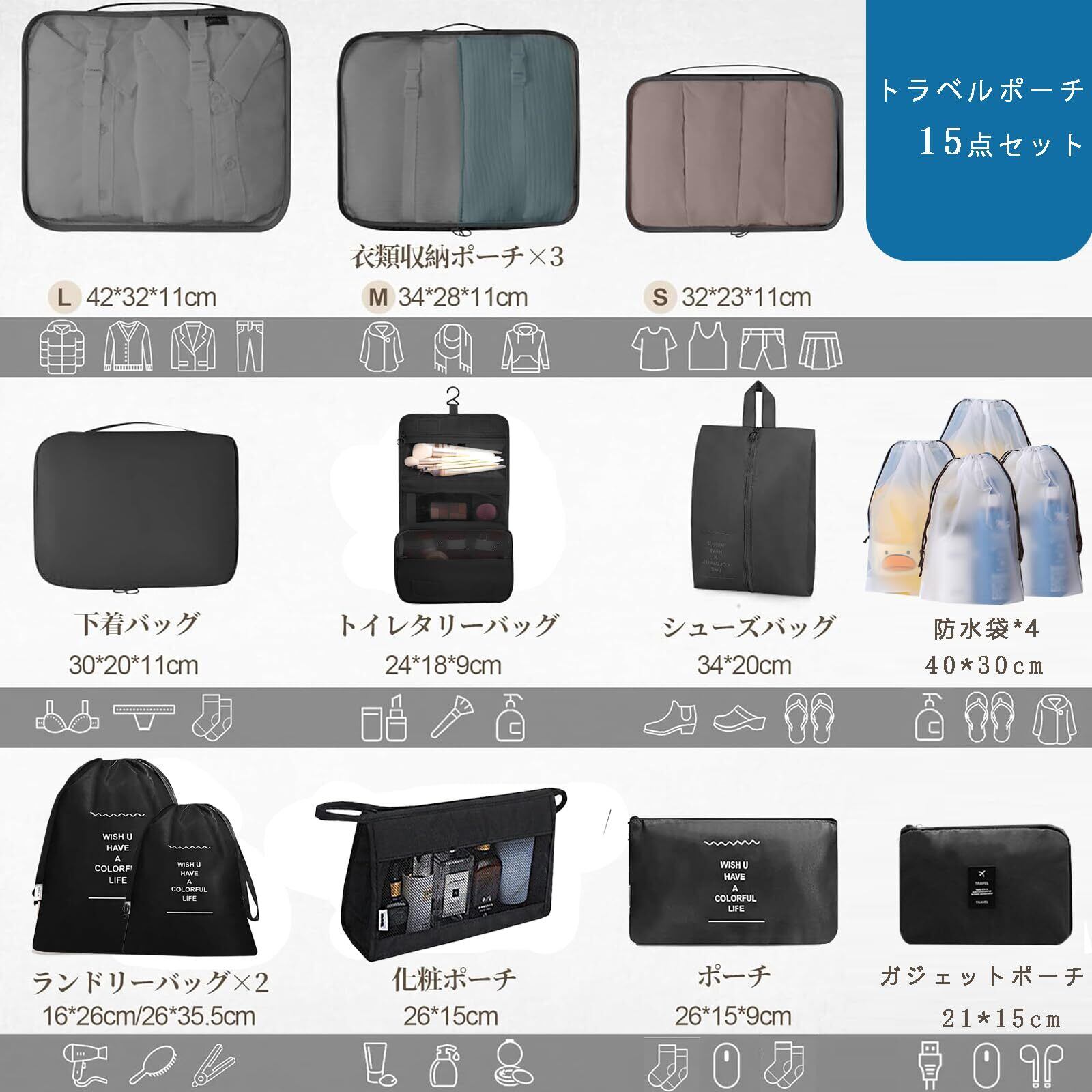 【パッケージにあるもの】衣類収納ポーチL42*32*12cm、M34*28*12cm、S32*23*12cm、下着パジャマ28*20*12cm、トイレタリーバッグ:24*18*9cm、ガジェットポーチ:21*15cm、シューズケース:35*21.5*10cm、巾着袋*2:35.5*26cm/16*26cm、防水袋*4:40*30cm、小物入れポーチ:25*16cm、洗面用具ポーチ:26.5*16*8cmです。