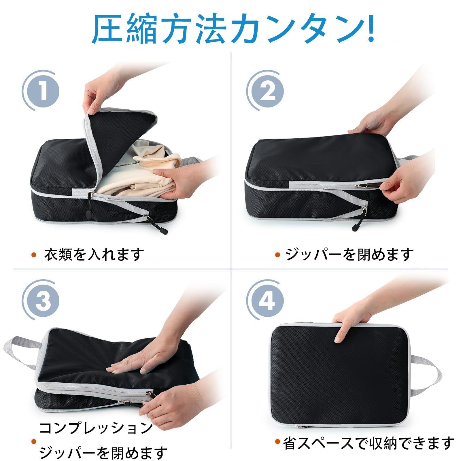 【圧縮トラベルポーチ】通常の圧縮袋とは異なり、圧縮吸引機が不要なので、かさばる衣類も瞬時に小さくなります!ジッパーを閉めるだけでバッグを圧縮できます。小さく見えますが、実はたくさんの衣類が収納できます。収納が苦手な方でも簡単に荷物を整理して快適な旅をスタートできます。ストレスフリーな梱包を実現