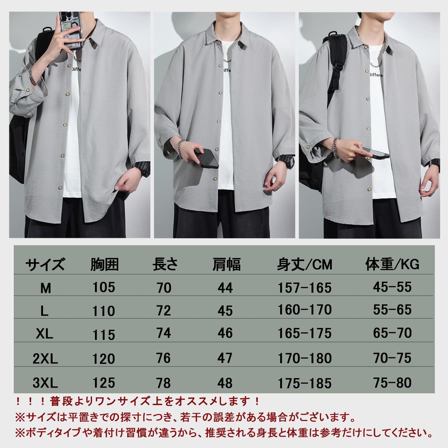 !!!普段よりワンサイズ上をオススメします。【SIZE:M】身長の目安:157-165cm 体重:45-55kg; 【SIZE:L】身長の目安:160-170cm 体重:55-65kg; 【SIZE:XL】身長の目安:165-175cm 体重:65-70kg; 【SIZE:2XL】身長の目安:170-180cm 体重:70-75kg; 【SIZE:3XL】身長の目安:175-185cm 体重:75-80kg; ※左の写真のサイズ表を参照してください。