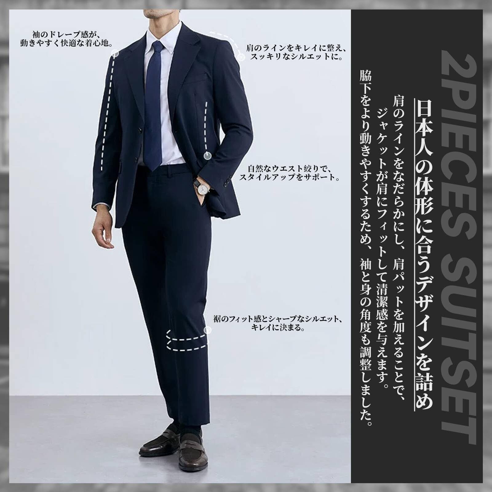 【日本人向け・デザイン】日本人の体形に合うデザインを詰めたスーツセットアップです。肩のラインをなだらかにし、肩パットを加えることで、ジャケットが肩にフィットして清潔感を与えます。さらに、脇下をより動きやすくするため、袖と身の角度を調整しました。腰もラインで絞り、美しくビシッと見えるシルエットに仕上げています。