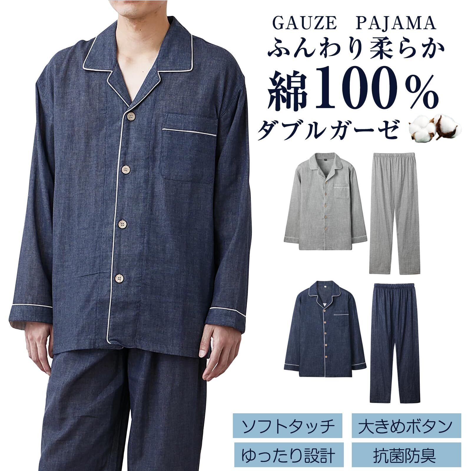 [レコーン] パジャマ メンズ 長袖 綿100% 二重ガーゼ 上下 セット ルームウェア 前開き ガーゼパジャマ 部屋着 肌に優しい 柔らか 吸汗通気 薄手 快適 おしゃれ 入院用 父の日 ギフト 春 夏 秋