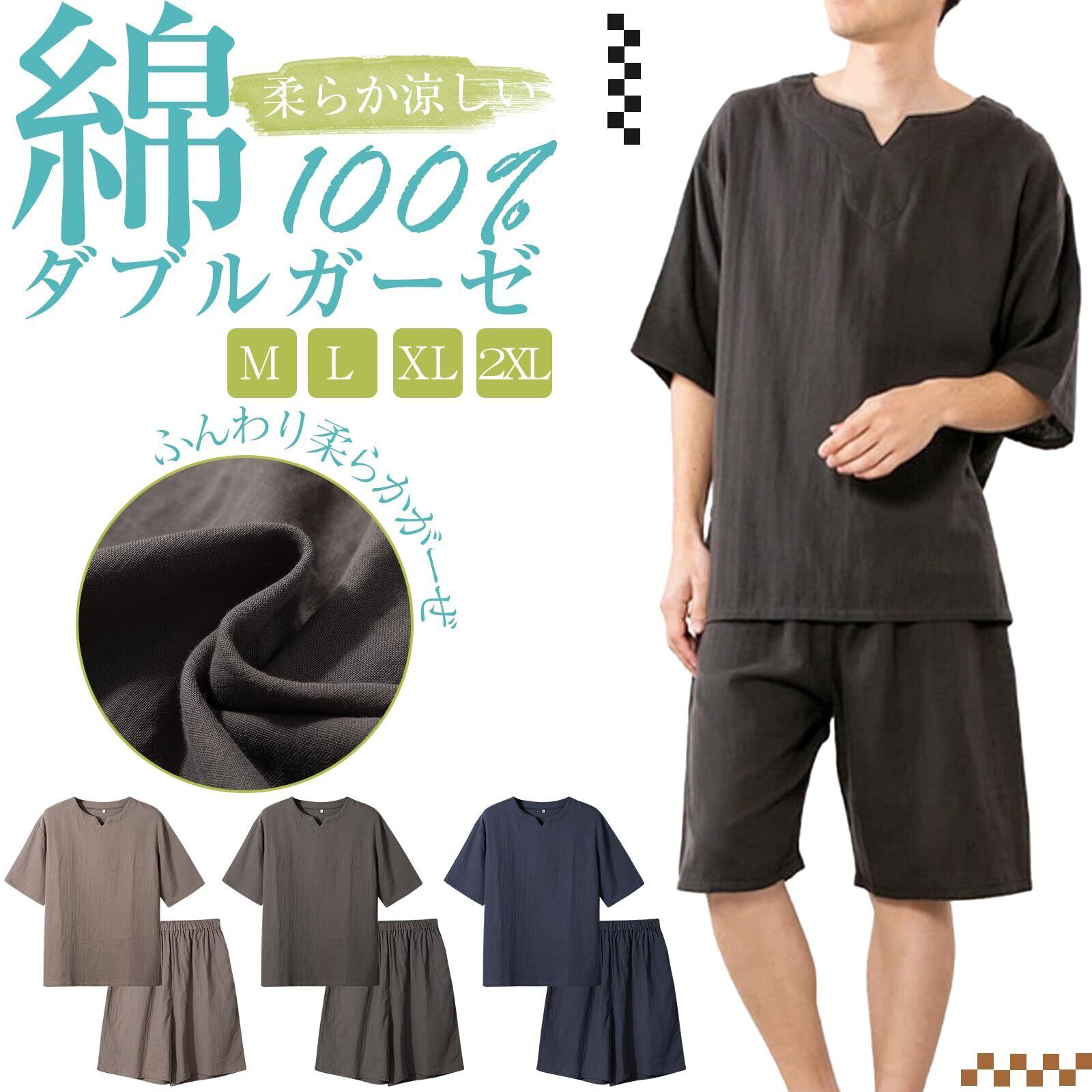 [ヒルトップクラウド] パジャマ メンズ 夏 半袖 綿100% 2重ガーゼ ルームウェア 上下セット 五分袖 ハーフパンツ ガーゼパジャマ 部屋着 肌に優しい 薄手 無地 快適 吸汗通気 涼しい 大きいサイズ 父の日 ギフト