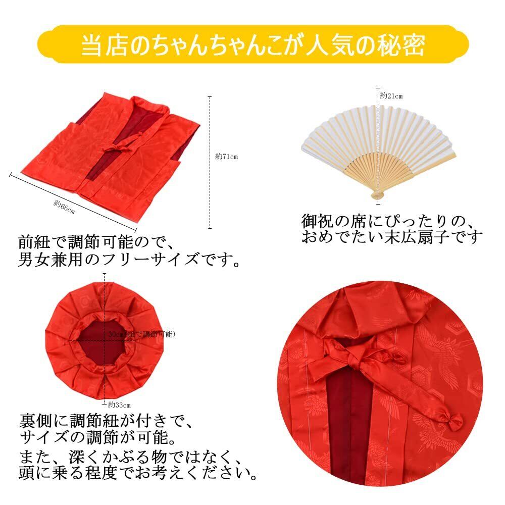 注意点:ちゃんちゃんこや頭巾に関しましては、長寿お祝いの撮影用などに一時的に着用するものとなりますので、ちゃんちゃんこは羽織るという感覚で、また頭巾に関しては、頭に乗せるという感覚でお使いください。 当店では、お取りせず“しつけ糸”をつけた状態でお届けしております。お客様の方でご利用の前に外して頂くようお願い申し上げます。