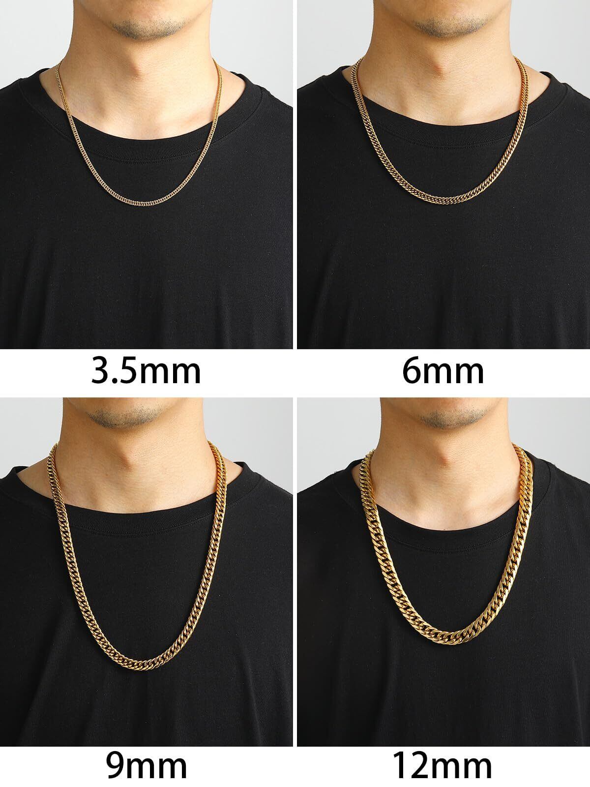 【色も!太さも!長さも選べる!】3.5mm、6mm、9mm、12mmの4太さ、シルバー、ゴールド、ブラックの3色、46cm、51cm、56cm、61cm、66cm、71cm、76cm、91cmの8長さ、全72種類を揃えました!