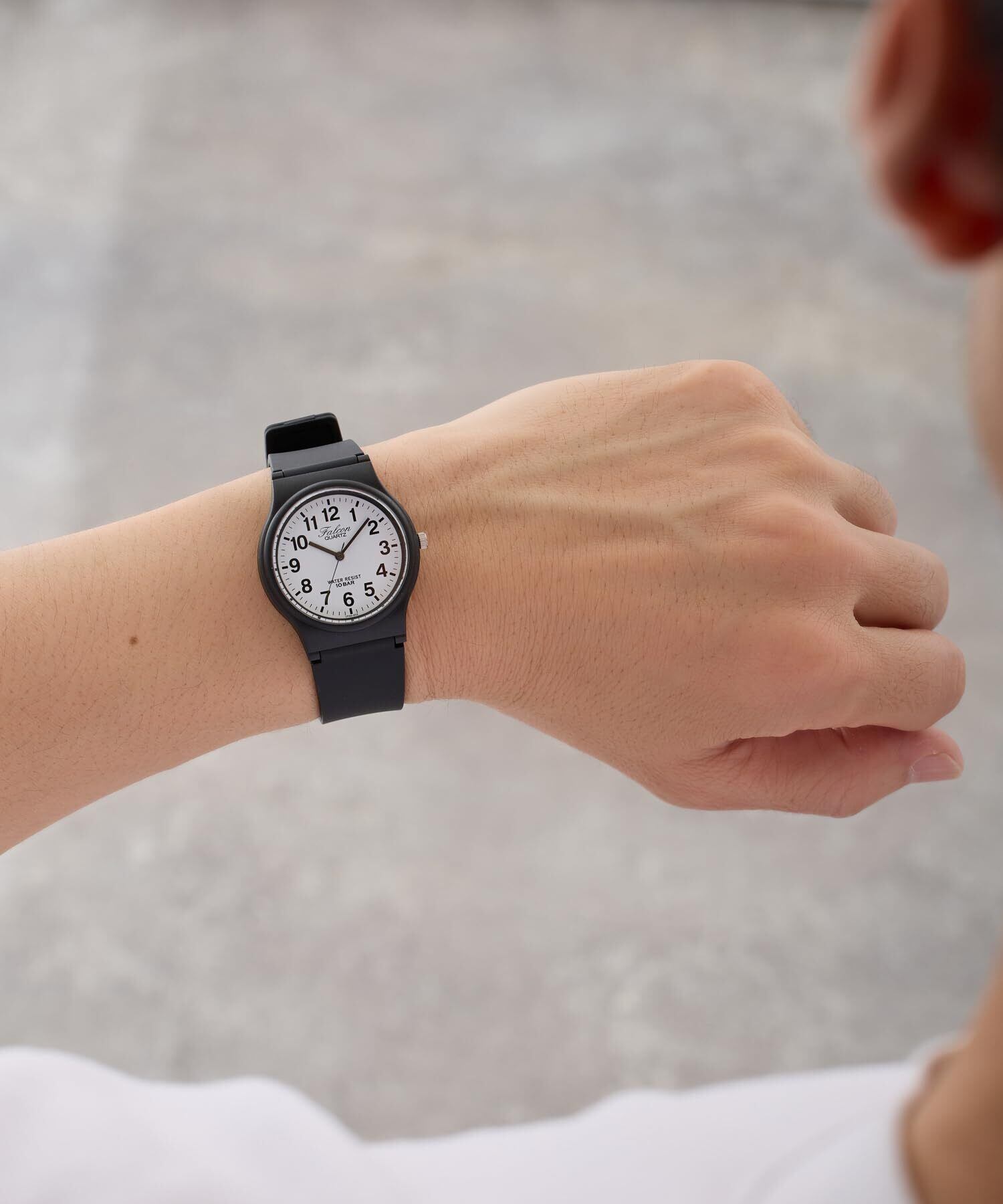 シンプルで見やすい文字板と10気圧の防水性を備えた、普段使いに最適なスタンダードな腕時計。ベルトは汚れに強く、耐久性に優れたポリウレタンを使用。ケースや風防には、樹脂やアクリルを使い軽くて丈夫な仕上がりになっています。34ミリと少し小さめなサイズなので、女性やお子様用としても最適です。