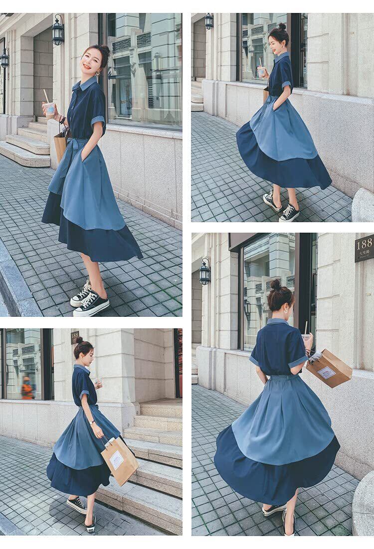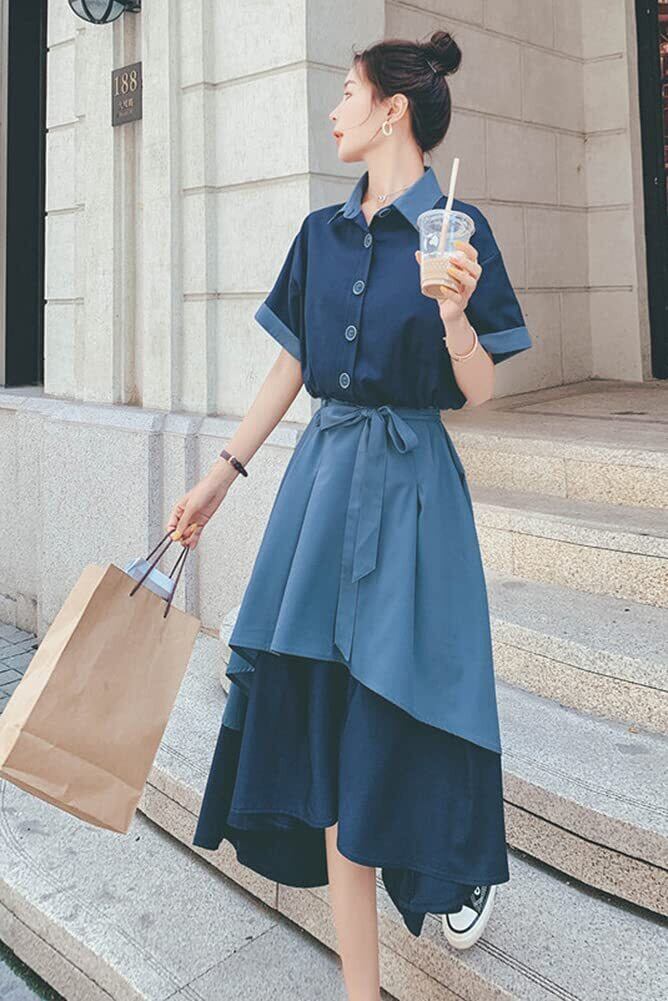 [Chubikime] シャツワンピース レディース 夏 ティアード ドレス ミディアム丈 ワンピース フレア Aライン ゆったり レトロ きれいめ