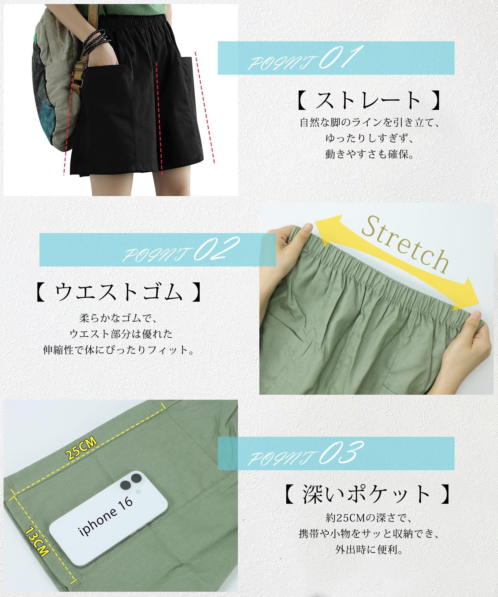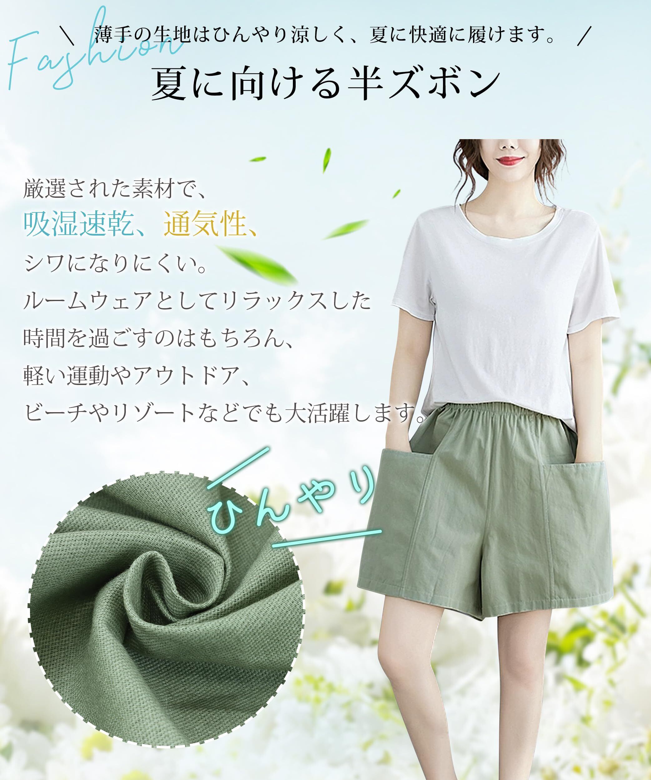 ショートパンツ レディース 五分丈 夏 【体型選ばずストレートタイプ・超深型ポケット付き】 綿 カーゴパンツ ハーフ ゆったり 着痩せ 通気性 速乾 ウエストゴム 無地 カジュアル 半ズボン スポーツ アウトドア