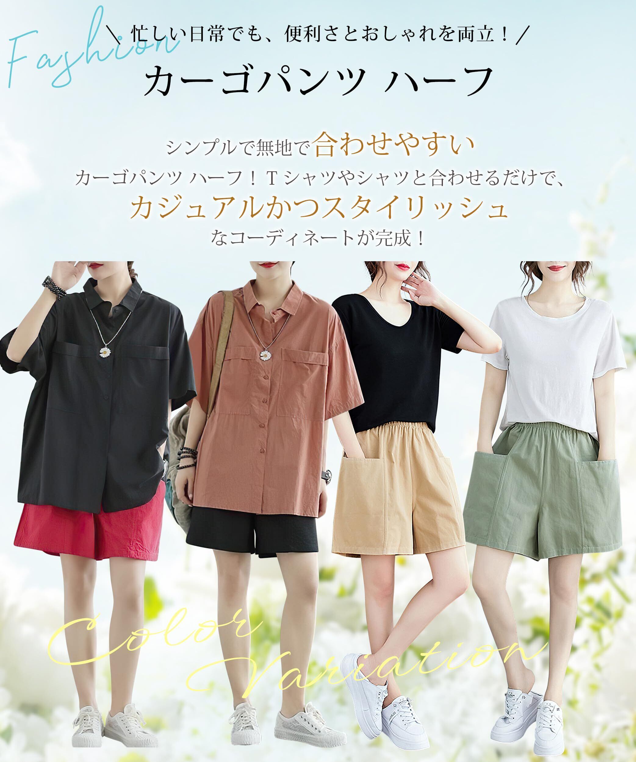 【ウエストゴム・ストレートタイプ】このレディース ショートパンツはウエスト部分に柔らかいゴムを使用し、体にぴったりとフィット。定番ストレートな形状のショートパンツは、脚の自然なラインを見せるように仕立てられています。ゆったりしすぎず、また動きを締め付けないです。どんな体型の方にも合うよ。このカーゴパンツ ハーフはストレートタイプで、ゆったりとした着心地をお求めの方には、ワンサイズ大きめのご購入をおすすめいたします。