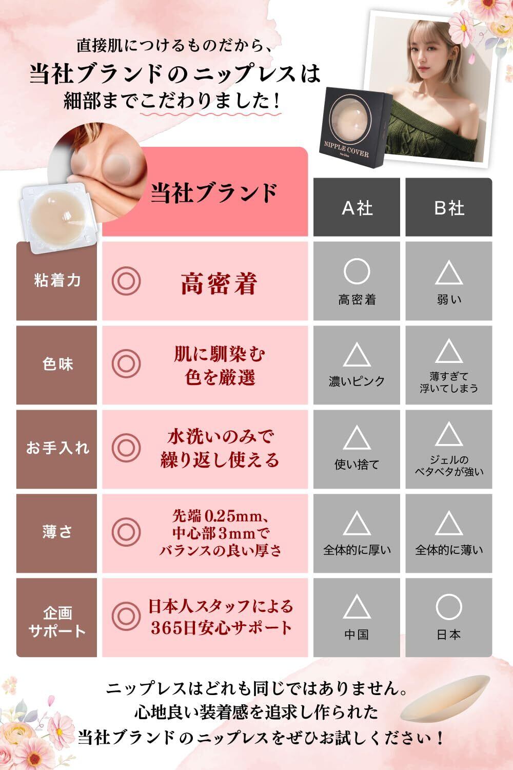 【高品質シリコン100%でベタつきにくい】Tomjenの女性用ニップレスは、シリコン製なので、ジェルやシールのように強いベタつきでお肌を傷めることなく優しい使い心地。