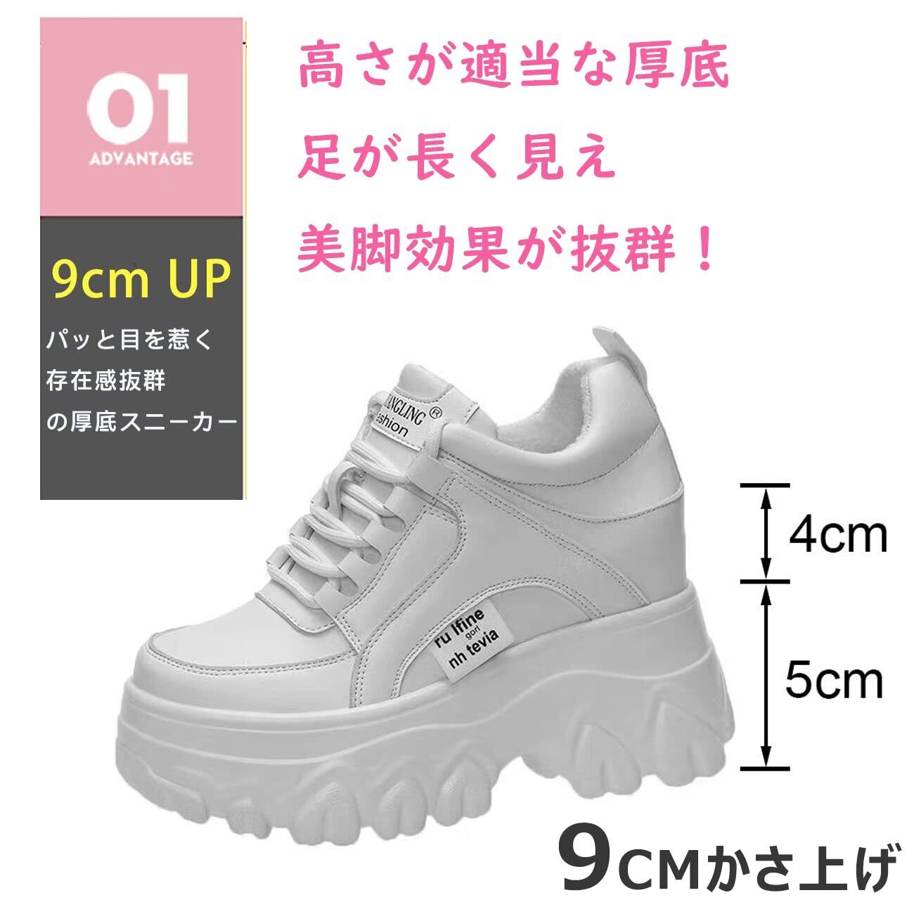 【9cm厚底】4cmのインヒール+5cmのアウトソールがあり、靴を履く瞬間に9センチの身長アップして、足元をしっかりと引き立て、抜群の美脚スタイルを実現します。通常より身長が高く見えますので、適度な体格比率をアップし、自信を増強します。