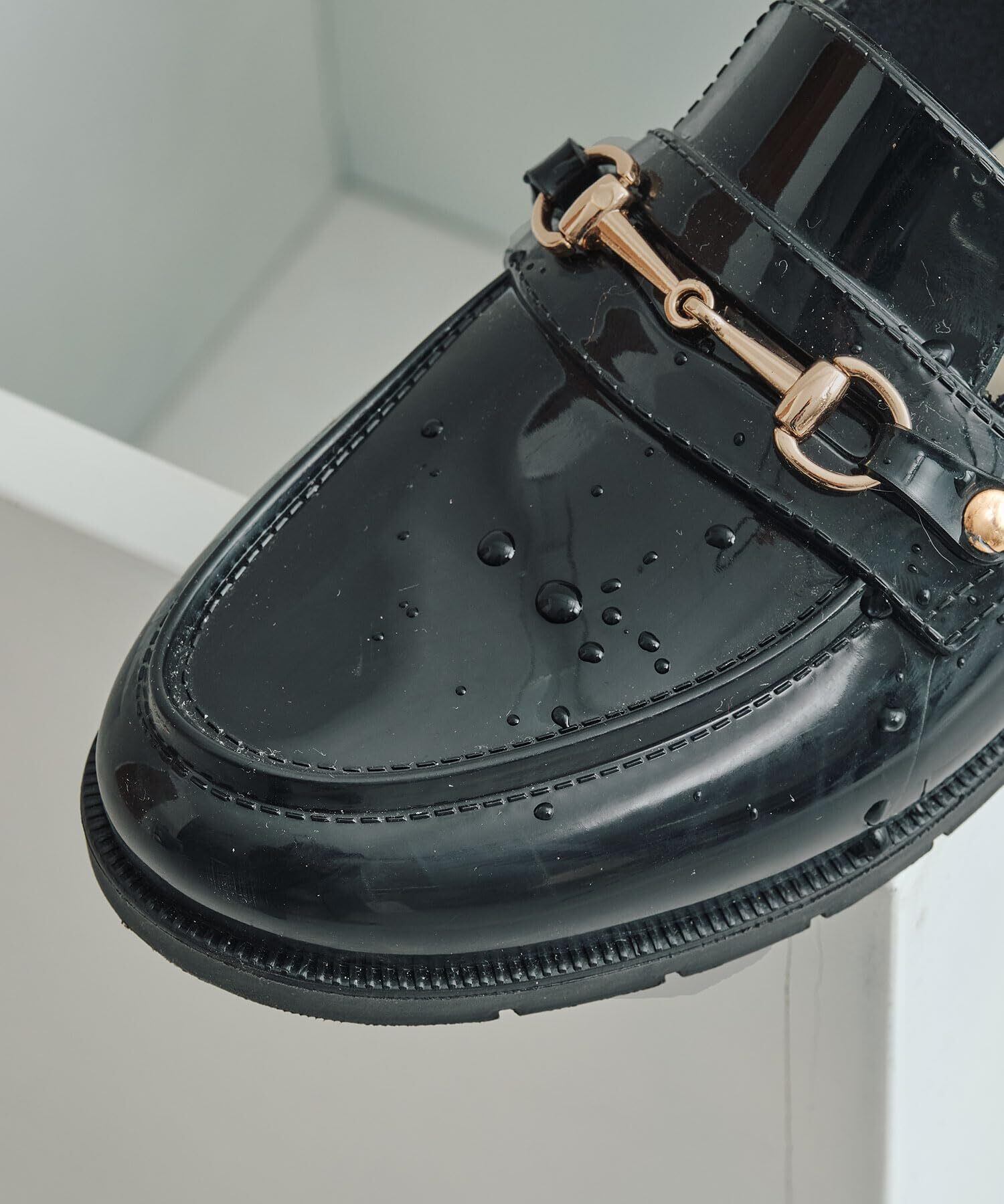 大ぶりのビットモチーフにゴールドの金具を付けた高見えするデザインで、雨の日でも普段と変わらないスタイリングを楽しめる大活躍のレインシューズ。アッパー全体が柔らかいのが特徴で、歩行時の足の負担を軽減してくれる。フェイクのステッチデザインでアクセントを付けながら、雨水の侵入もしっかり防いでくれる優秀アイテム。