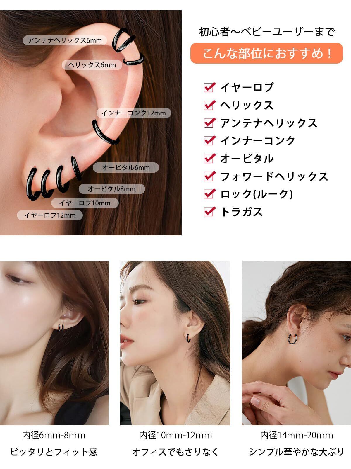 [小さいピアス] ピアスの内径は6mmから20mmまでの8サイズご用意しましたのでお好みでお選びください。内径6mmピアスはとても小さいので、イヤーロブ・ヘリックス・トラガス(軟骨)・アンチトラガス・オービタル・ダイス・ロック(軟骨)・アイブロウ・リップ(口ピアス)・セプタム・マディソン・ヴァンパイア・タンウェブ・スクランパー・アンチスクランパー・ユブラ等の部位におすすめです。