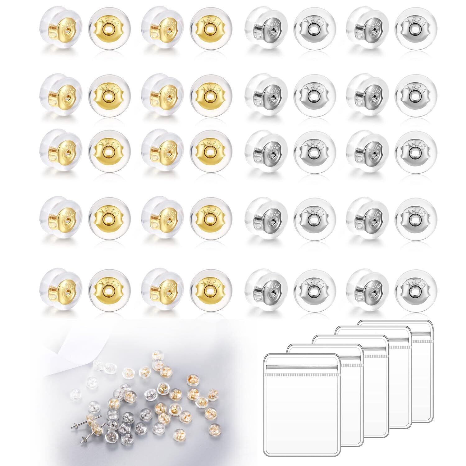 ピアス キャッチ シリコン 落ちない ピアスキャッチ 留め具 金属アレルギー対応 K18メッキ ピアスキャッチシリコン 20ペア(40個)セット ポスト対応0.65mm~0.7mm レディース メンズ 透明収納袋付き (金+银)
