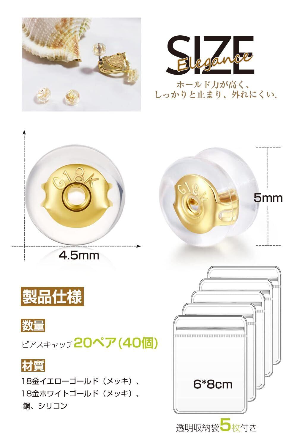 【ピアス外れない】はコラム0.65mm ~ 0.7mm対応、20対(40本)一組、18金メッキロック+シリコン製です。イヤリングをおしゃれに楽しみたい人に最適なイヤリングキャッチです。耳を美しく飾り、装着時の安定感を保ちます。