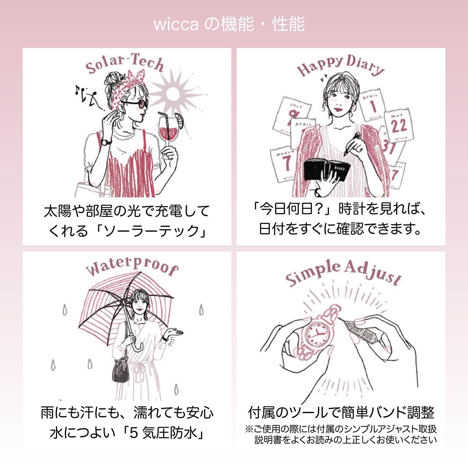 【大人っぽいデザインが魅力のデイトモデル】ベーシックなフォルムのケース、クラシカルなローマ数字インデックス、レールのような切分を採用した、少しハンサムで大人っぽいデザイン。wiccaは、見つめるたびきゅんとするデザインと、私に寄り添ううれしい機能。wiccaが刻む “ときめくとき” は、小さくても輝く、魔法のような幸せをきっと引き寄せてくれるはず。