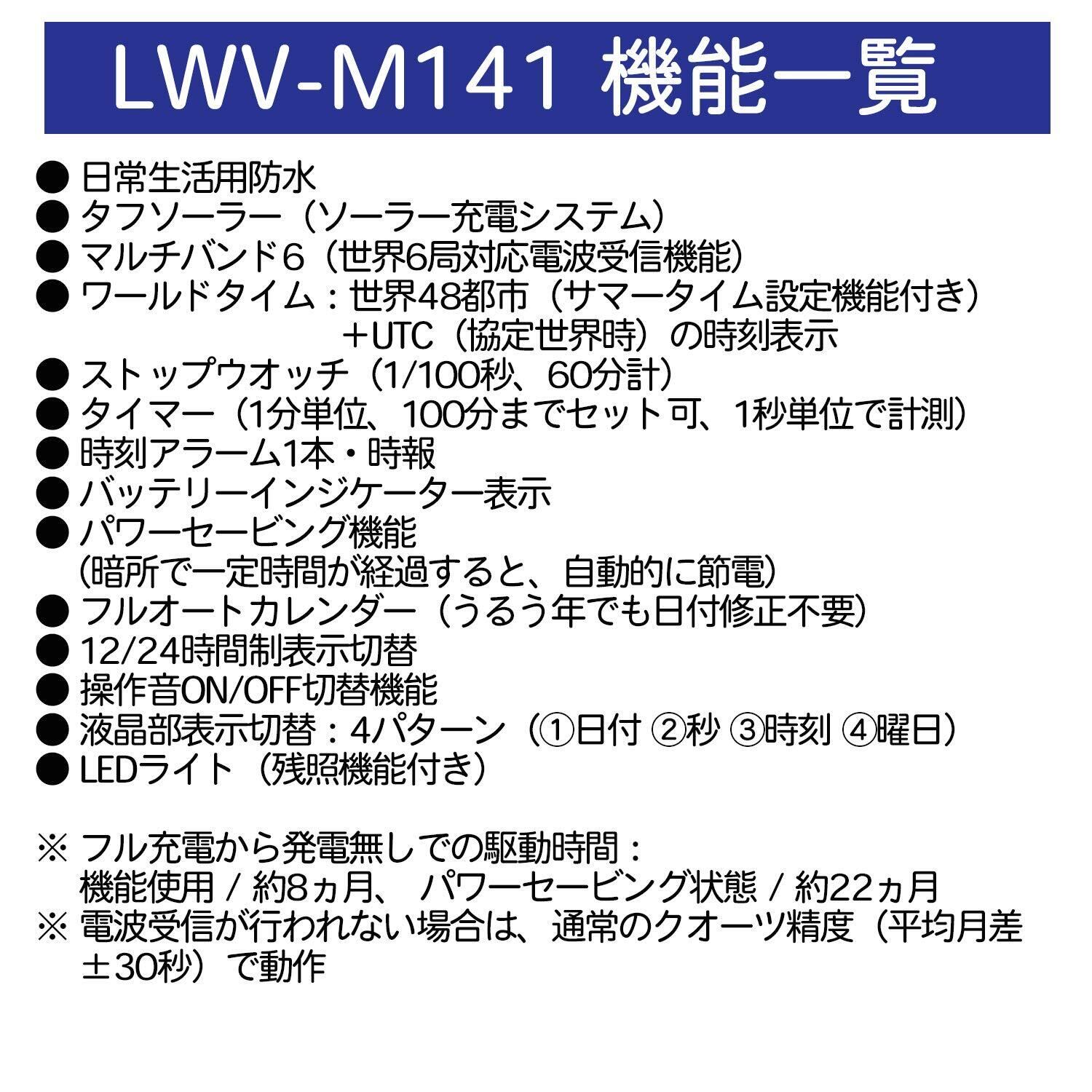 カジュアルなデザインでオン・オフを問わず気軽に使える女性用ソーラー電波時計。電波受信機能は日本のほか、アメリカ・ヨーロッパ・中国の標準電波にも対応する最新のマルチバンド6。また、6時位置の液晶部分には曜日や日付のほか、ワールドタイムやタイマーなど便利な機能を搭載。メタルバンドにはサイズ調整が簡単にできるフリーバックルを採用。