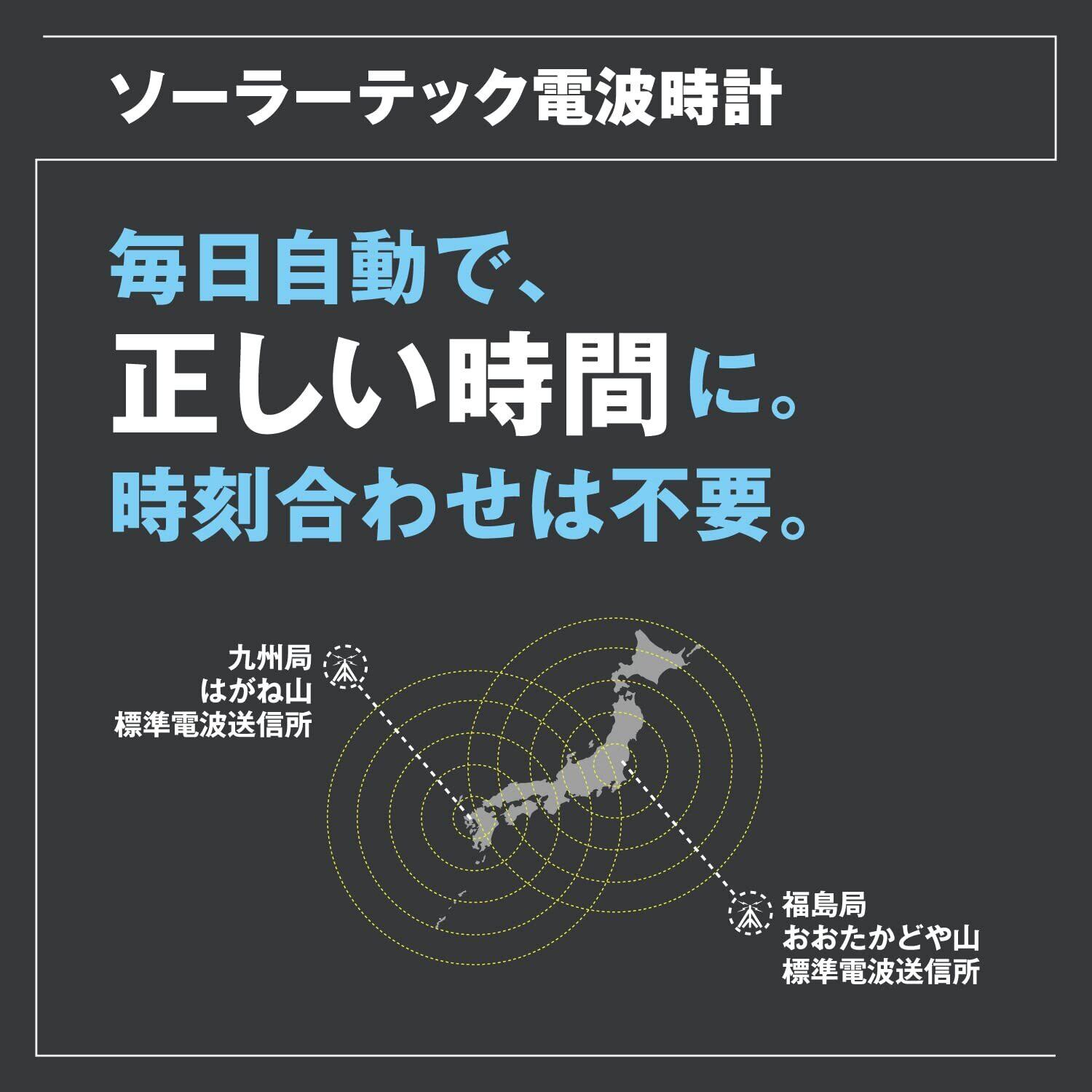 【自動で時刻修正をする「電波時計」】誤差は10万年に1秒といわれている原子時計をもとに送信される標準電波を受信し、自動的に時刻やカレンダーを修正。 福島局と、九州局の2ヵ所から送信される電波を受信し、正確な時刻を得ることができます。