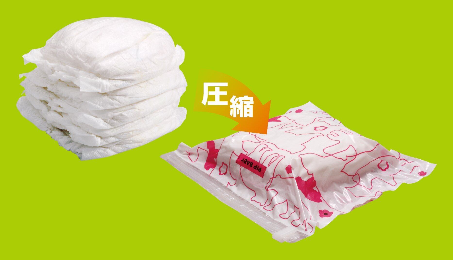 この製品は、使用前の紙おむつを入れて、まるめて押すことで圧縮できます。圧縮された紙おむつを袋に入れて、スライダーでとじてください。お出かけの際に便利です。