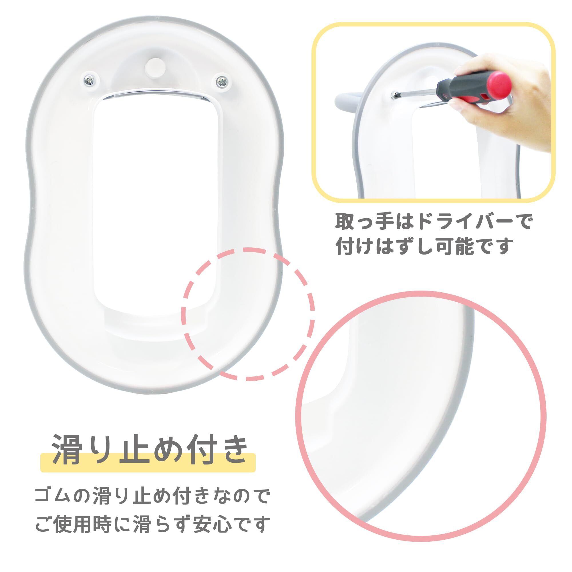 【材質】ポリプロピレン:本体・取っ手・便座 / TPE:便座のフチのゴム部分 / スチール:ネジ