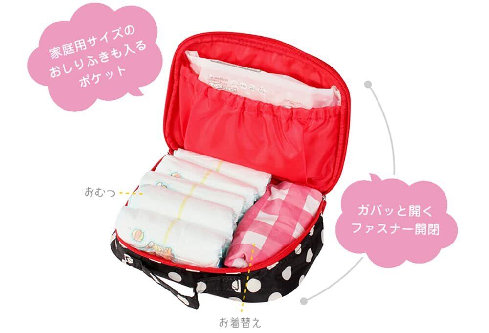 おでかけで必要な枚数のおむつが、すっきり収納できるおむつポーチ。コンパクトなサイズながら、新生児から一番大きいパンツ型まですべてのステージに対応。ふっくらフタが膨らむデザインなので沢山収納することができます。ベビーとのおでかけに必要なおむつはもちろん、おしりナップ、新生児用お着替え、おむつ替えシートまで、全部まとめて入ります。おしりふきやミニタオルも入る便利なポケット付き。おむつ卒業後は、お着換え入れにしたり、化粧ポーチとしても長くお使い頂けます。撥水加工済み。