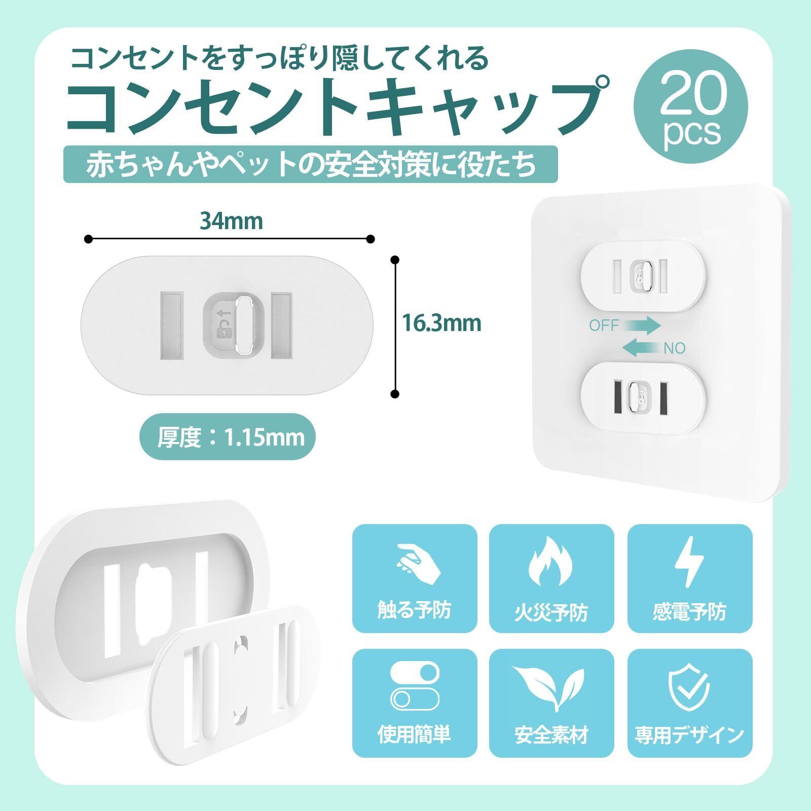 【大容量の20個セット】サイズ:34x16.3x1.15mm ご家庭のコンセント数を十分賄える大容量の安全プラグカバーセットです。自宅はもちろん、保育園、オフィス、老人ホーム、介護施設などにもおすすめです。
