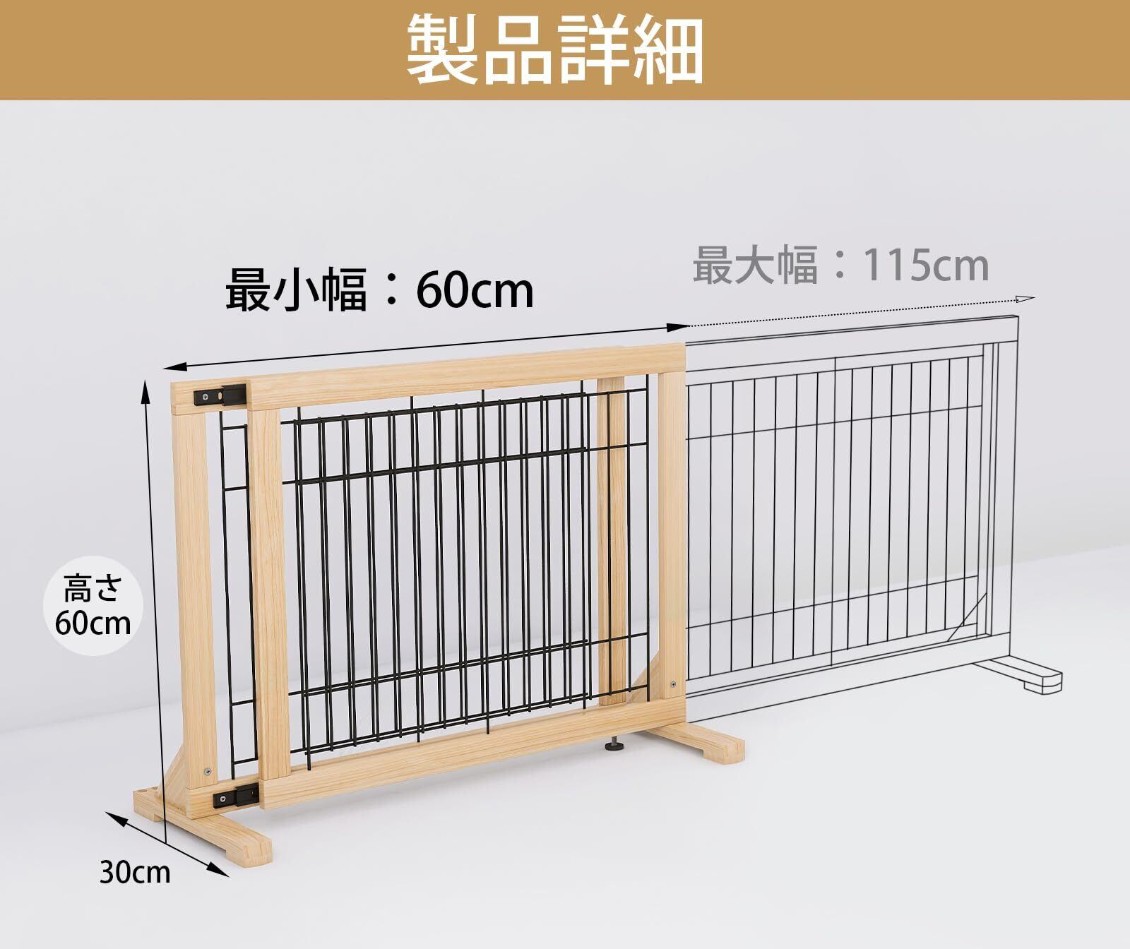 【調整可能、様々な場所に対応】:ペットフェンスの幅は、60cmから115cmまで拡張可能です。この範囲内でこの製品を使用できます。玄関、キッチン、階段など、さまざまな場所に置けます。