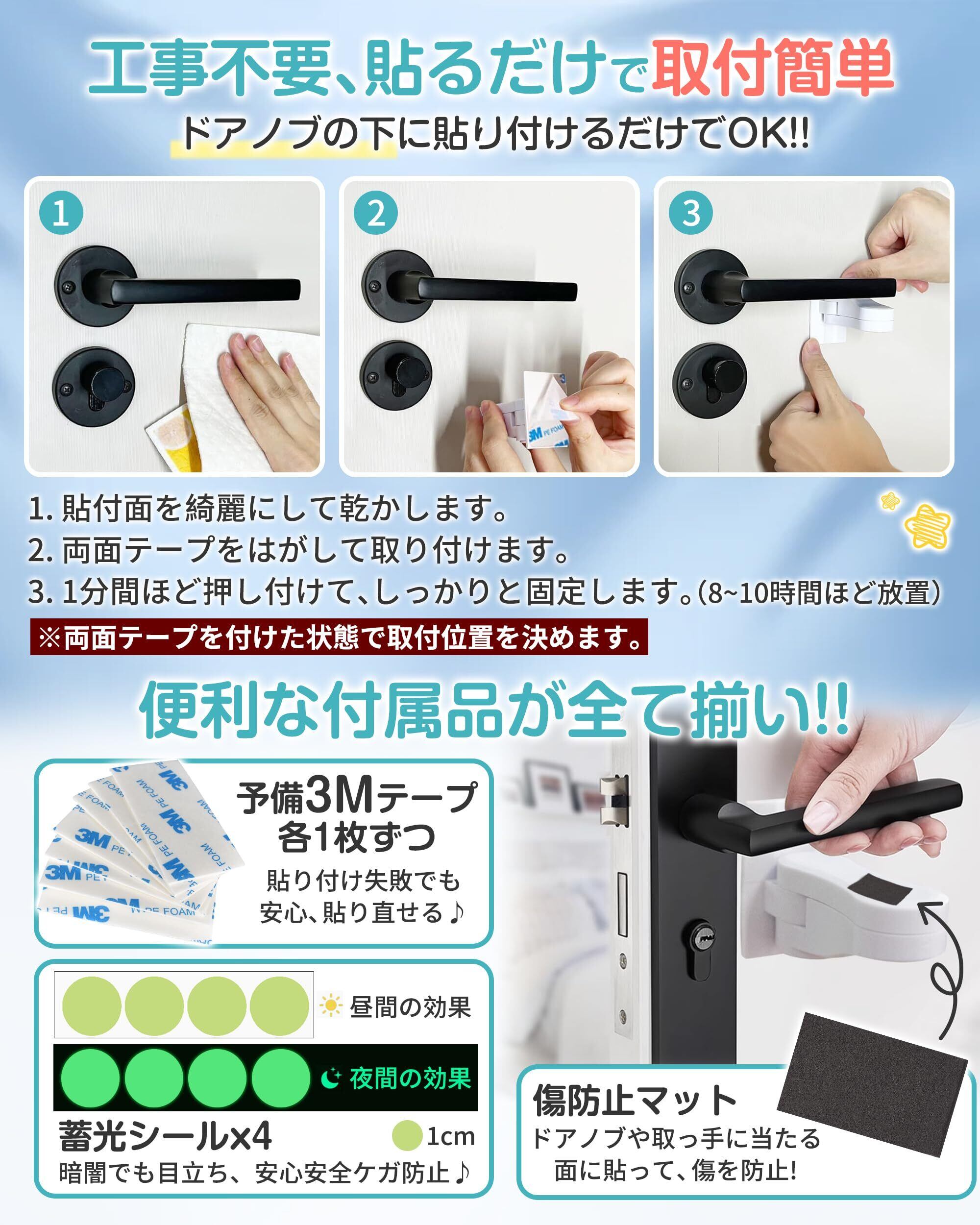 【信頼の3M社の両面テープを採用】3Mシールだからこその接着力で、部屋鍵後付けとして利用できます。粘着力が強く、しっかりと固定できる3M製テープが初めからついているのでフィルムを剥がしてあっという間に取り付け簡単。お子様の安全対策はもちろん、地震対策や介護にも。