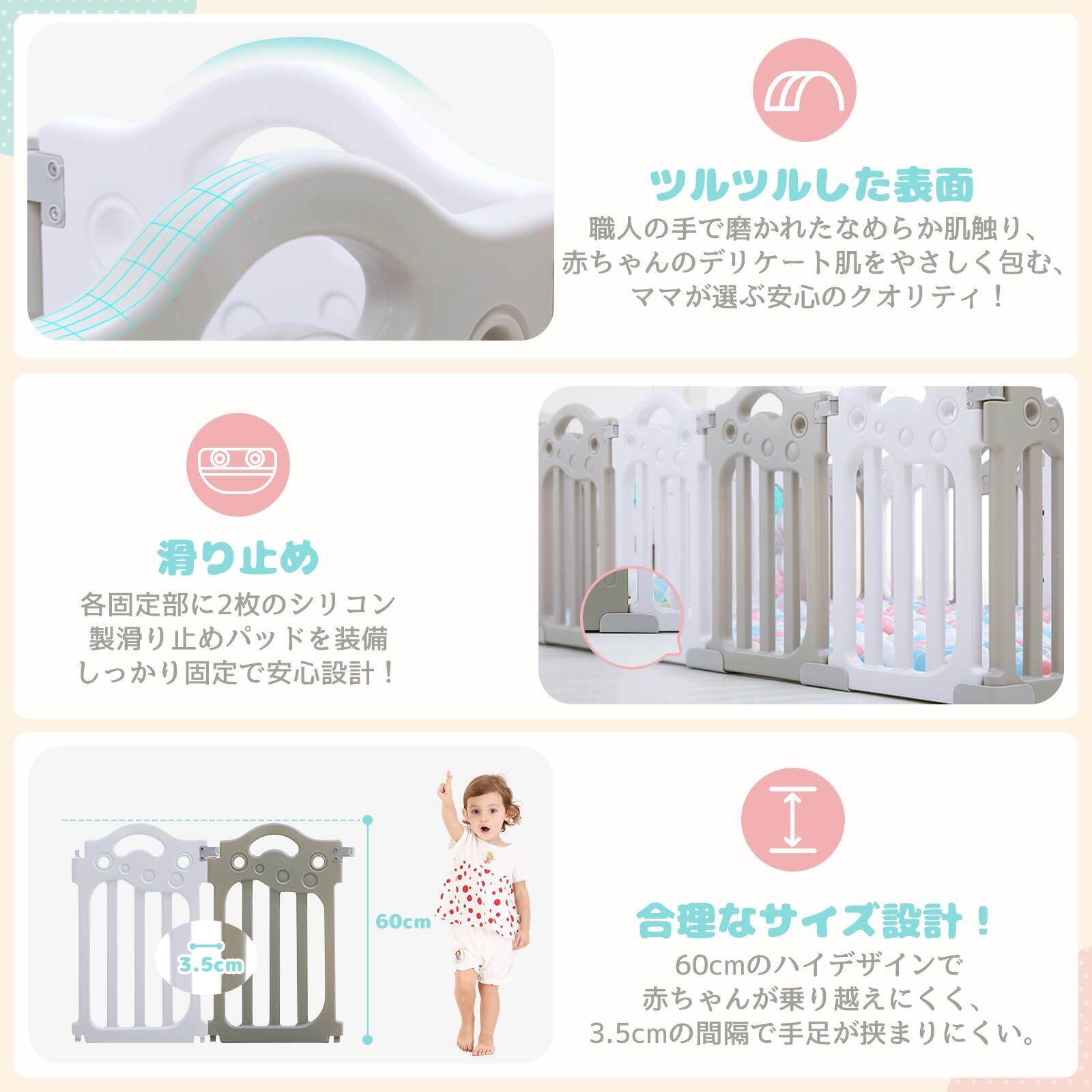 【安全設計3.5cm&60cm高さ】 パネル間の隙間を3.5cmに設計し、お子様の指や足が挟まる心配がございません。60cmのフェンス、赤ちゃんに適した高さ設計で、転倒時の乗り越え防止に効果的です。保護者様が家事をされる間も安心してご利用いただけます。