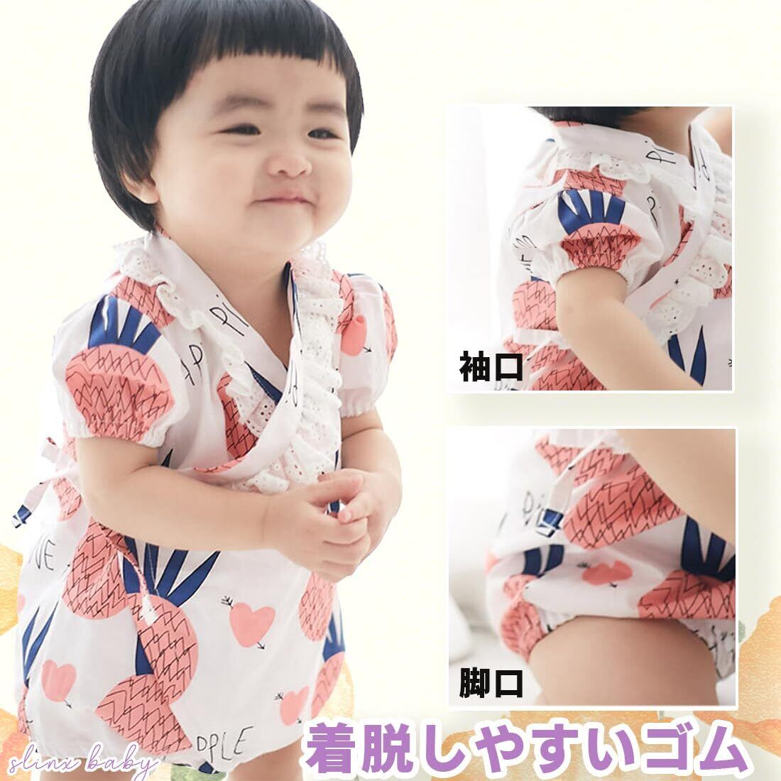 花満開プリント、女の子の可愛さをアップする襟元のフリルホワイトレース+インパクトの花柄~パイナップル果物 柄もあり、超かわいいカバーオール。個性溢れる図柄に惹かれる可愛いベビー浴衣。