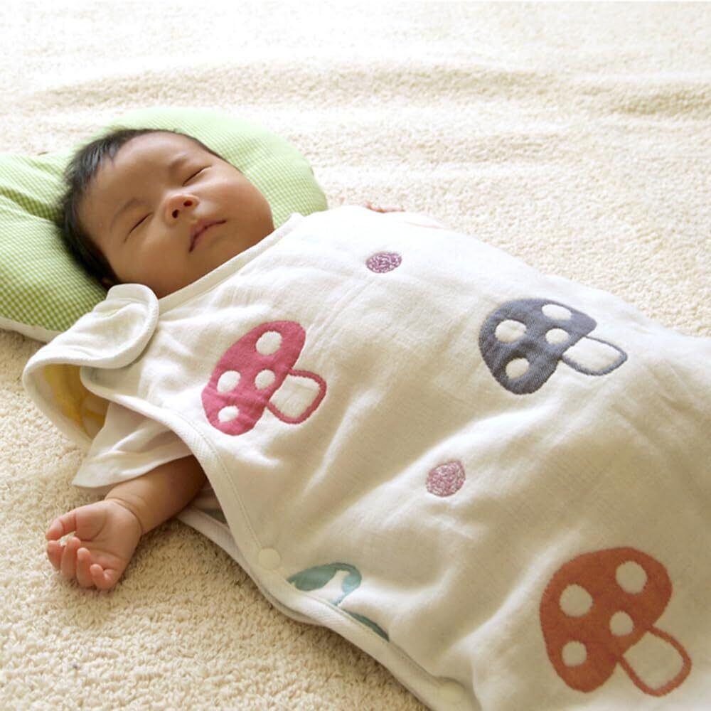 `champignon (シャンピ二オン)とはフランス語で`きのこ'の意味。カラフルなきのこのモチーフは、男の子、女の子を問わず使っていただけます。織目の密度が異なるガーゼを6層に重ねることで、ふんわり空気を含み、寒い時は保温性を発揮し、暑い時は汗を素早く吸収しさらさら。寝冷え防止に1年中活躍し、お布団からはみ出しても安心。大きくなってもベストとして使えます。