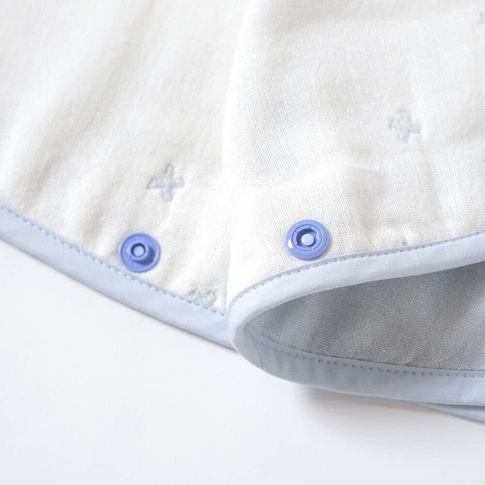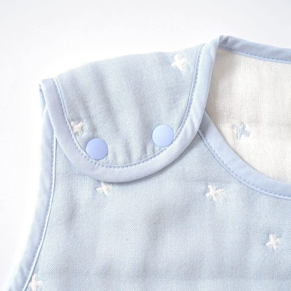寝冷え防止に活躍する6重ガーゼキッズサイズスリーパー。 寝る時に着せておけば、おふとんからはみ出しても安心です。 股下の部分にはボタンがついているので、はだけてしまうのを防ぎます。 右肩・両脇はスナップボタンで全開するので、着せる時もおむつ替えも楽々です。 中層にコットン糸を、肌に触れる表・裏層にはオーガニックコットン糸を使用することによって柔らかな触り心地に仕上げました。 【ふくふくガーゼ】 吸水性と保温性を兼ね備え、1年中ずっと使えます。 表面は細い糸、真ん中に進むにつれて太い糸を使用して織ることで、ボリューム感を出し、洗えば洗うほどふっくら感が増すのが生地の特徴。 昔から織物が盛んな愛知県三河地方の高い技術力とこだわりを結集して作りました。 2018年に「おもてなしセレクション」を受賞した「ふくふくガーゼ」は、ご自宅用にもギフトにもおすすめです。 散りばめられたクロス柄は、天使のようであり、鳥や星の瞬きのよう。 “いつもあなたのそばに" 赤ちゃんの笑顔に引き寄せられ、赤ちゃんの周りには、自然と幸せがあふれています。 そんな、赤ちゃんの誕生を祝福するテキスタイルです。 やさしい色合いのシェルピンクと、甘すぎず、インテリアにも馴染みやすいパウダーブルーの2色展開です。