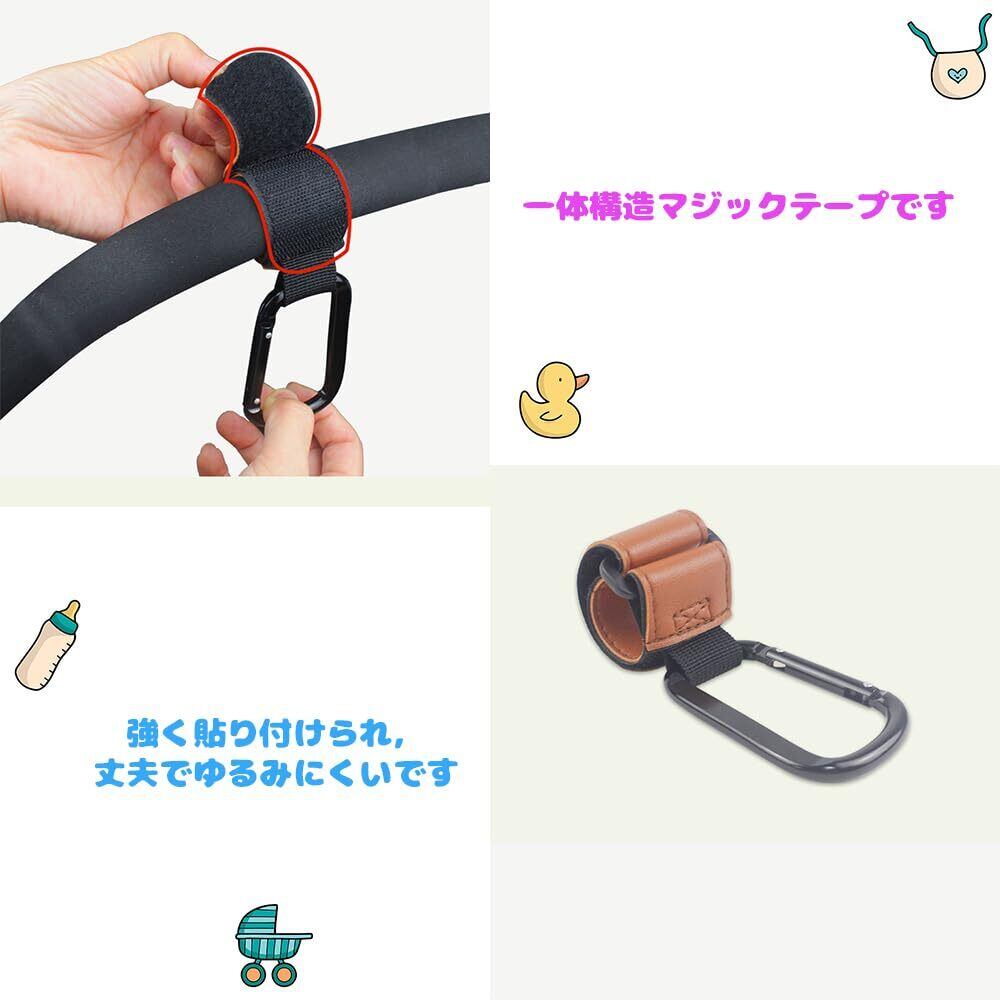 TUDOUZZZ ベビーカー フック バギーフック 大きいカラビナ ベビーカー 荷物フック 高級PU革 縫製・高級アルミ合金素材 頑丈 マジックテープ カラビナ バギーフック エアバギー 2個入り(ブラウン)