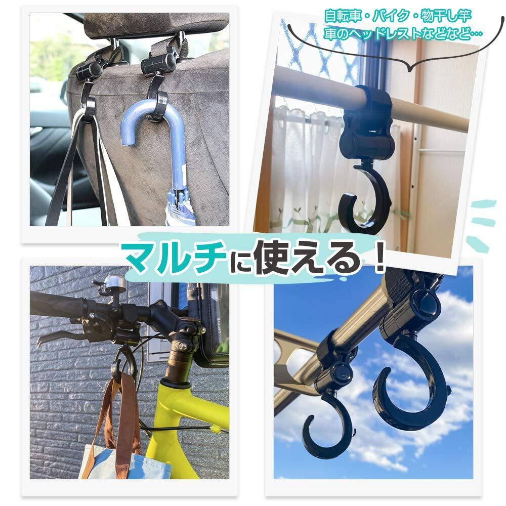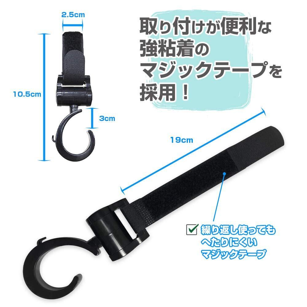 【360度回転】フック部分は360度回転するため、どの向きからも荷物をかけられ、非常に便利です。赤ちゃんを抱っこしながらでも、簡単に荷物をかけることができます。