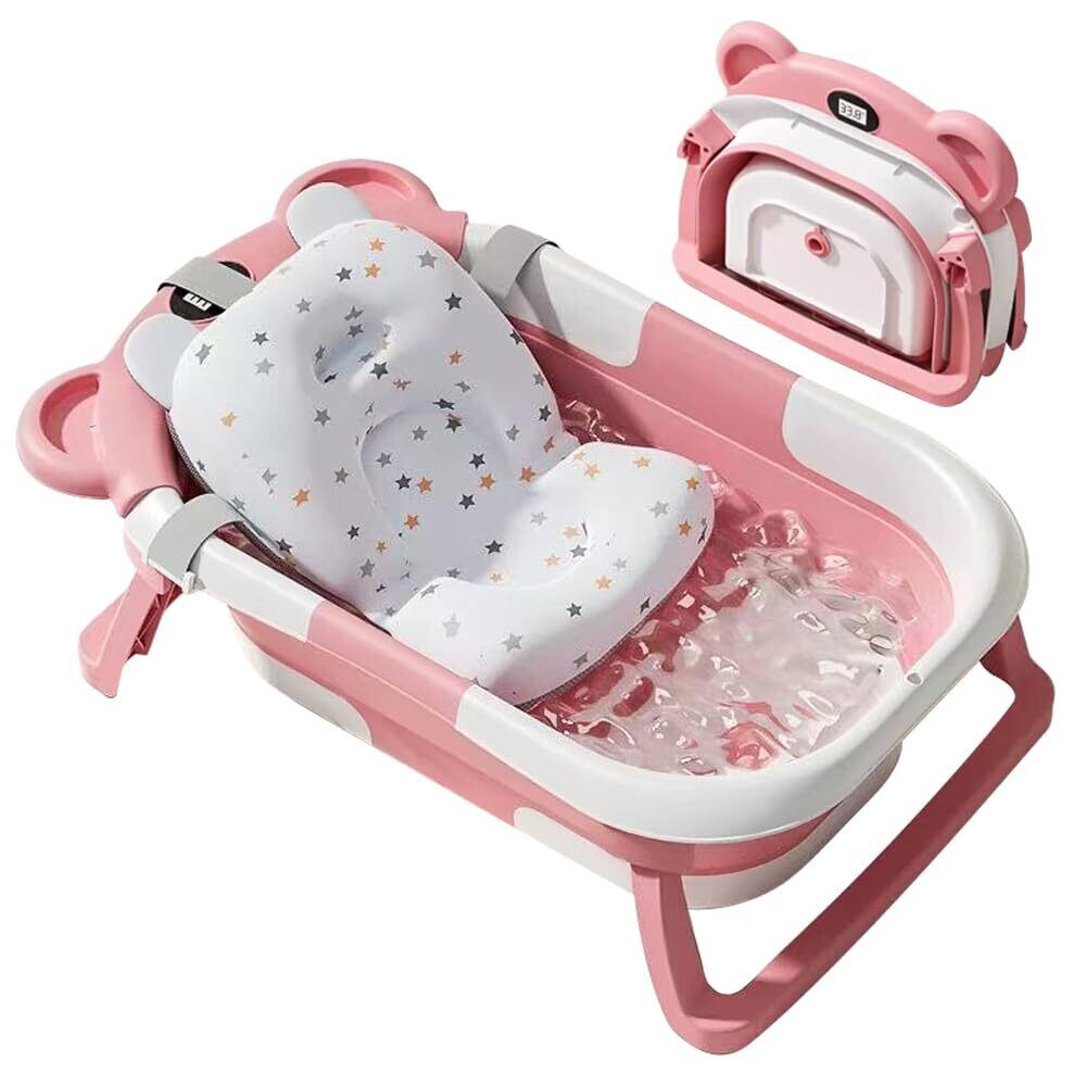 ZOOBLY ベビーバス 折りたたみ クッションセット 湯温計付き 収納便利 赤ちゃん お風呂 沐浴 バスチェア バスタブ コンパクト (ピンク)