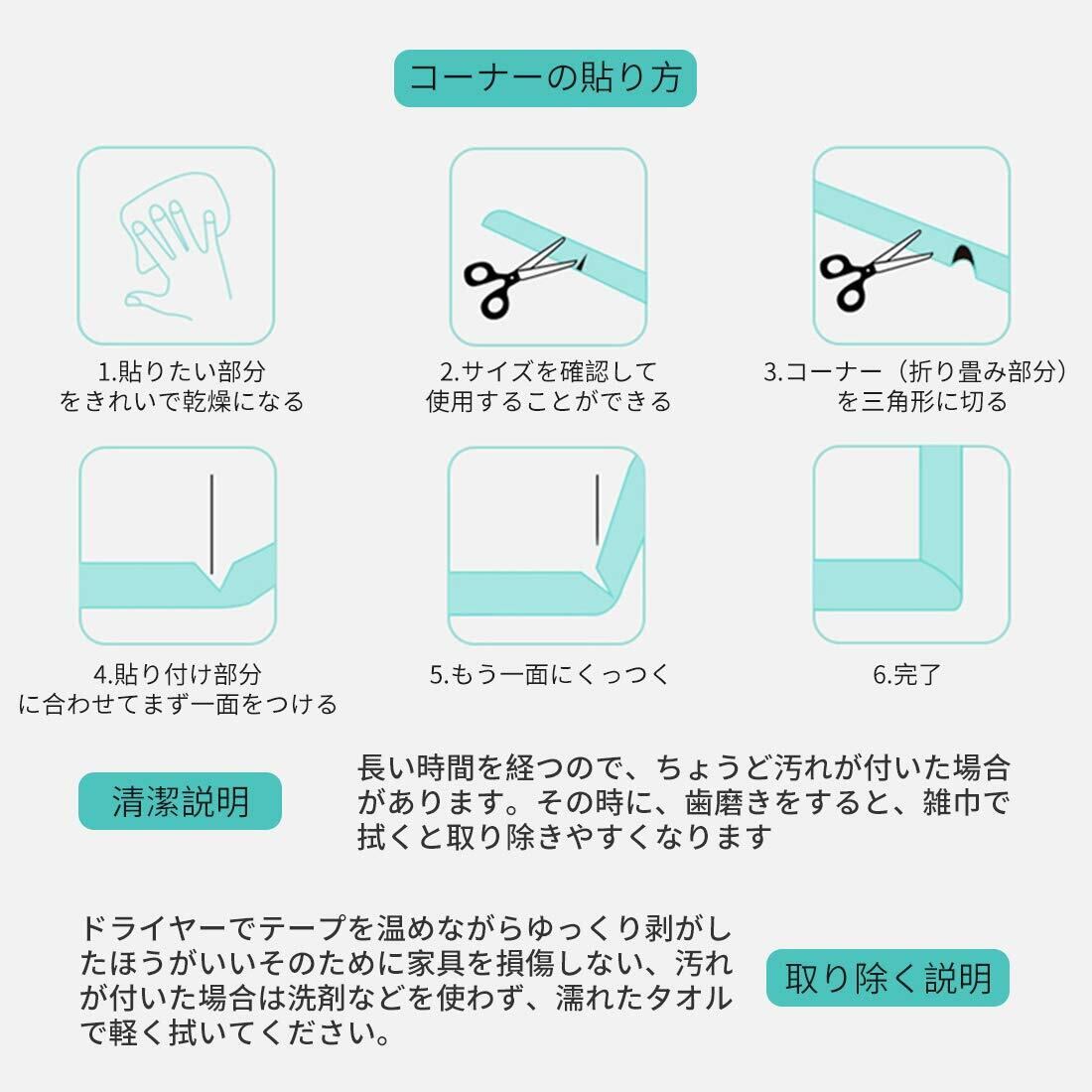 「取り付け超簡単」本商品は道具不要で簡単に取り付け可能です。コーナークッションは両面テープが貼られているので、自分でテープが貼ることは全然ありません。