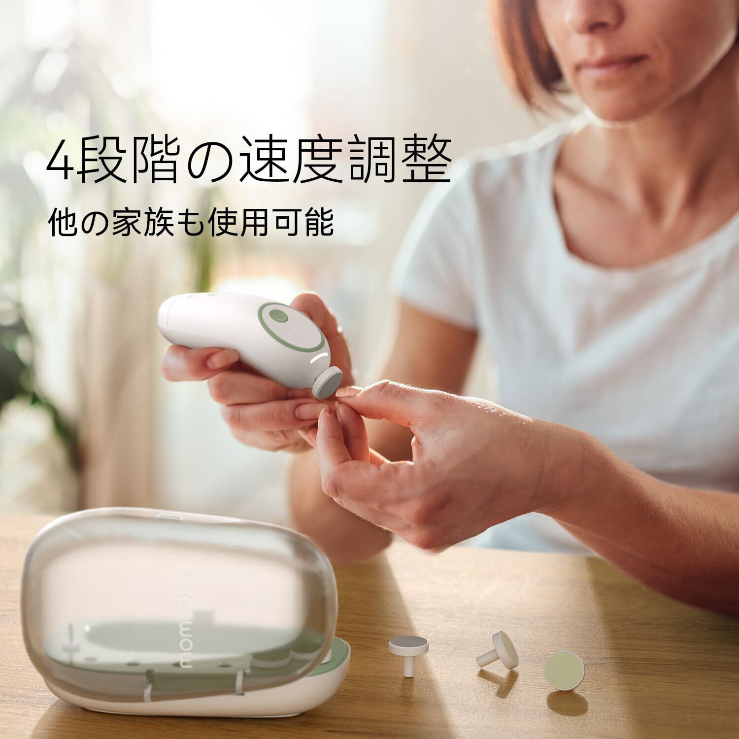 やさしいライト付き — 360°ソフトLEDライトを搭載しており、死角のないやわらかな光で、夜間の赤ちゃんのネイルケアにも最適です。まぶしさを抑え、赤ちゃんの目にもやさしい設計になっています。