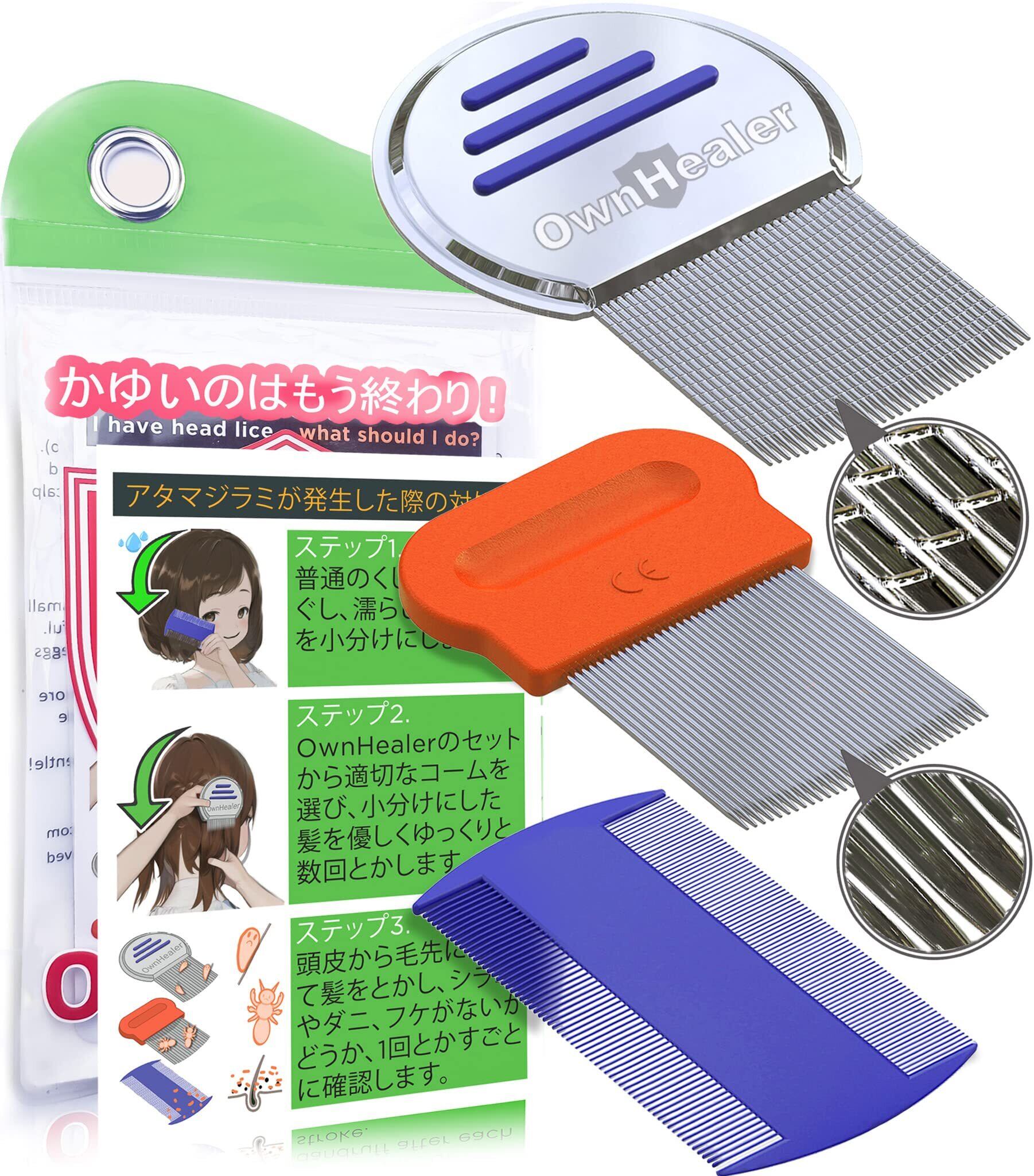 OWNHEALER シラミくしセット 3個入り シラミ 卵の検出・除去 子供から大人まで対応 含まれるもの インストラクション 収納用カバー
