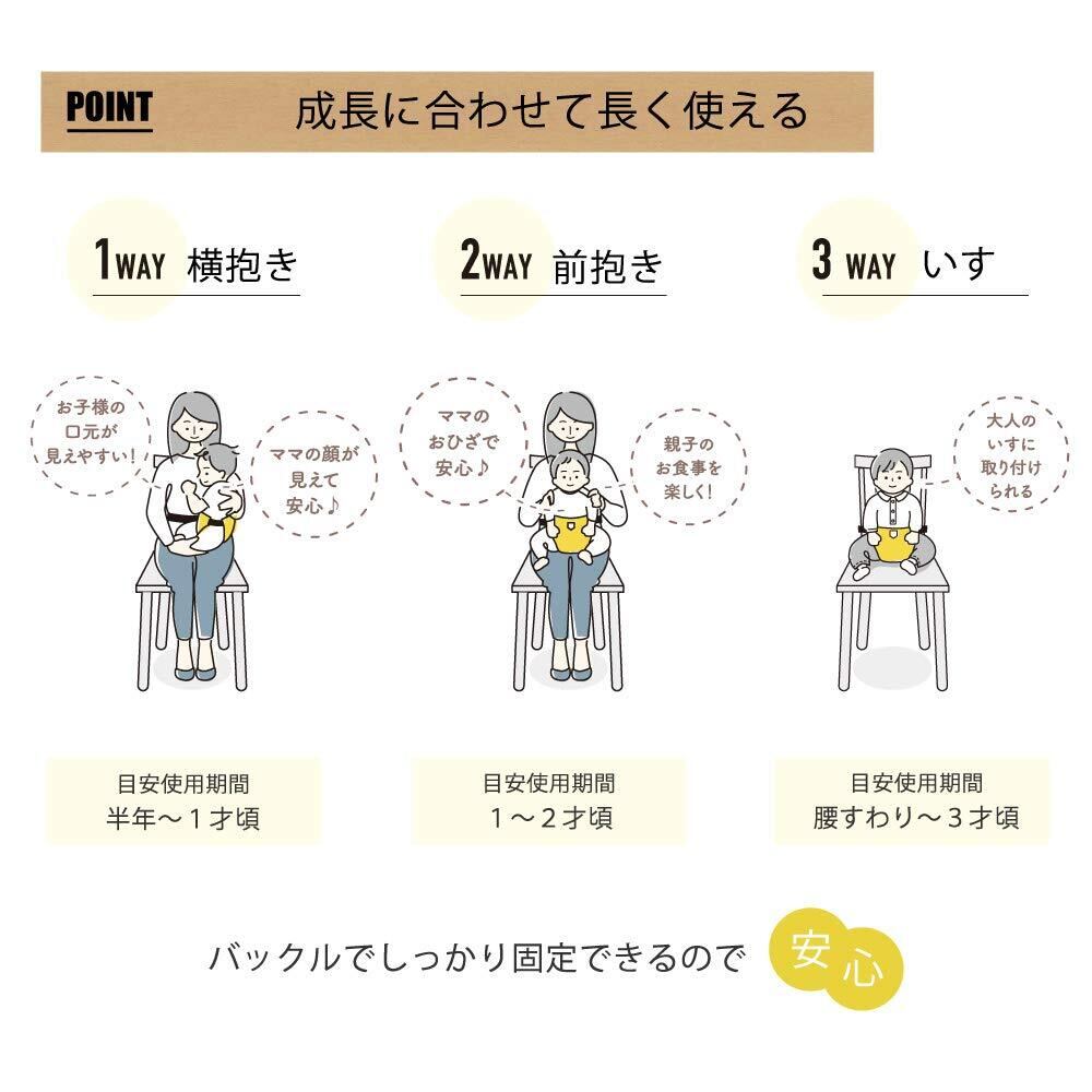成長に合わせて、横抱き・前向き抱き・椅子につけて、とシーンに合わせてお使いいただけます。