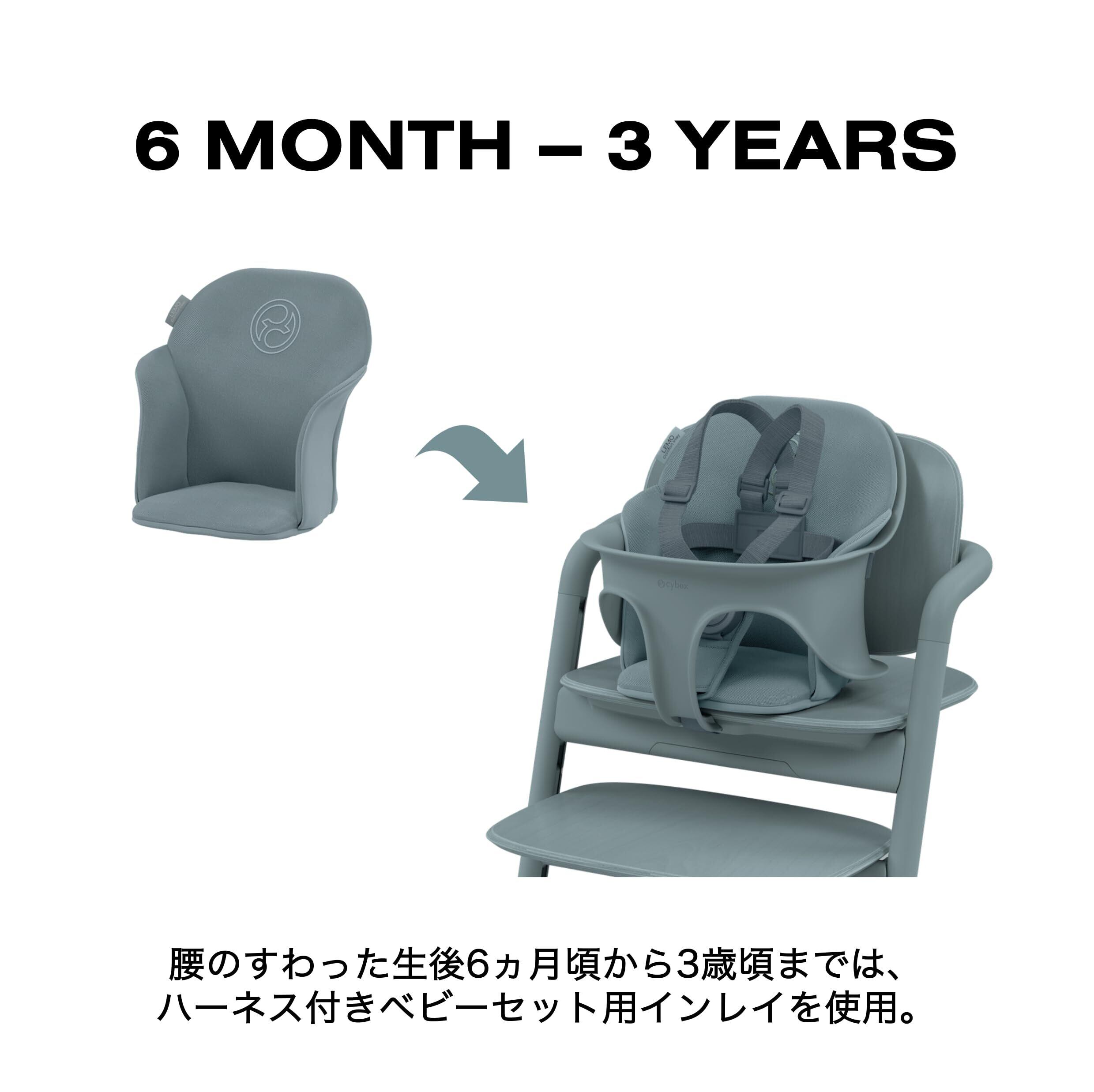 腰のすわった生後6ヶ月頃から3歳頃までは、ハーネス付きベビーセット用インレイを使用。