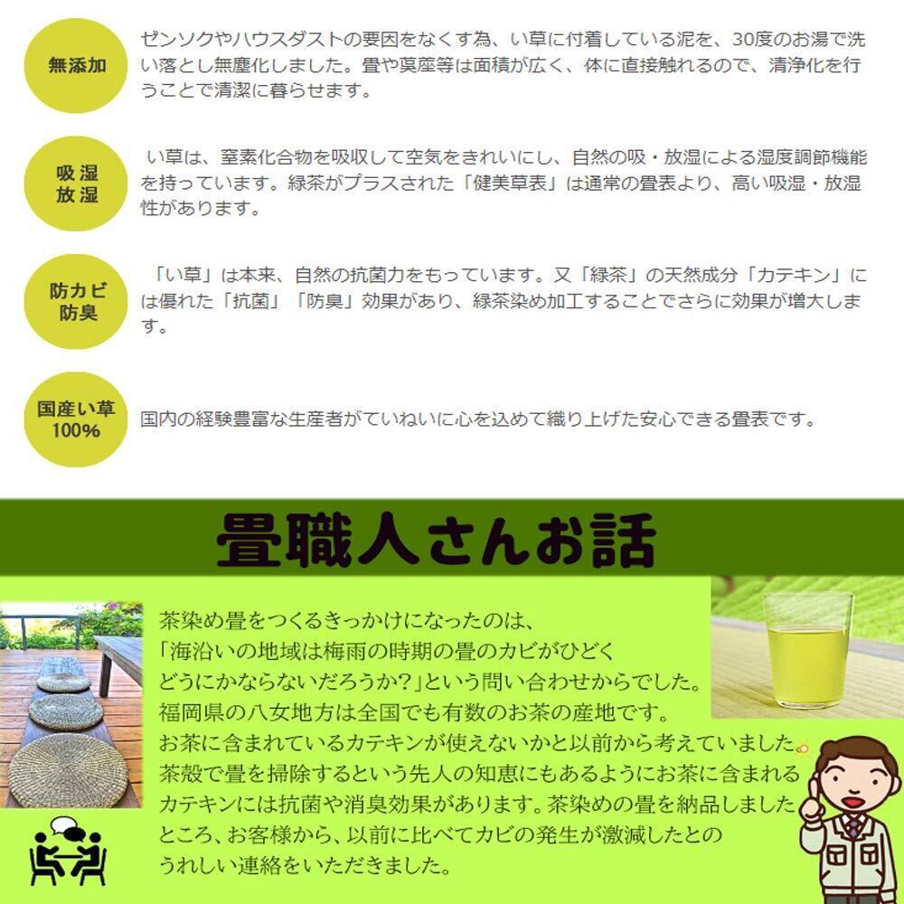 ナチュラル色以外はお茶成分を配合し、成分であるカテキンの抗菌作用や消臭・防虫j効果を備えるとともに耐久性も長く。色落ちも極めて少ない等、特性が付加された健康・安心・安全な高品質畳です。 ---------------------------------------------------