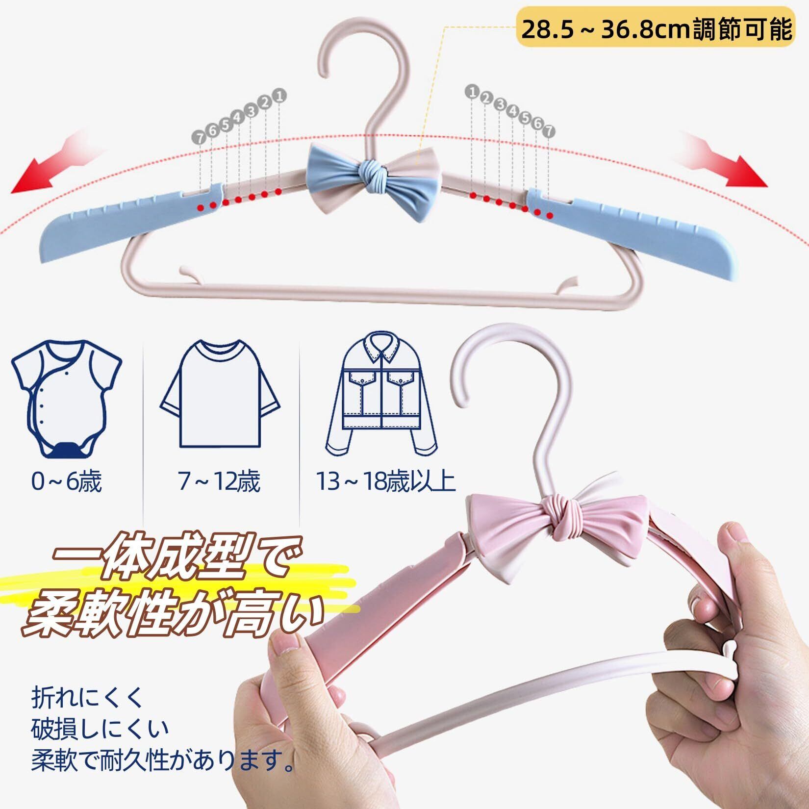 この「かわいい蝶結び付き伸縮式子供用ハンガー」は、赤ちゃんからお子様まで長く使える便利なアイテムです。28.5cmから36.8cmまで調節可能で、0~18歳以上の幅広い年齢層に対応。跡がつかない&滑り止め仕様で、大切な衣類をしっかり保護します。一体成型構造で耐久性が高く、柔軟性も抜群。さらに、小物用フック付きで、帽子やアクセサリーなどの収納にも便利です。かわいい蝶結びデザインがクローゼットを明るく彩り、実用性とデザイン性を兼ね備えたハンガーです。