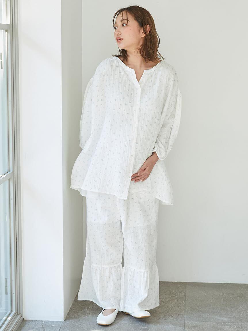 ソフトな風合いのダブルガーゼを使用し、季節感のある小花柄とストライプ柄で仕上げたマタニティシリーズです。ボリューミーなフリル裾の切り替えがフェミニンなロングパンツ。ウエストには幅広のシャーリングを入れ、優しいフィット感に。便利な脇ポケットも付けているので、マタニティのデイリーなルームウェアとして重宝します。腰元にはワンポイントでロゴ刺繍入り。色は小花柄のオフホワイトと、ストライプ柄の2色を揃えています。同シリーズのプルオーバーと合わせたり、KIDS、BABYサイズとのリンクコーディネートもお楽しみください。