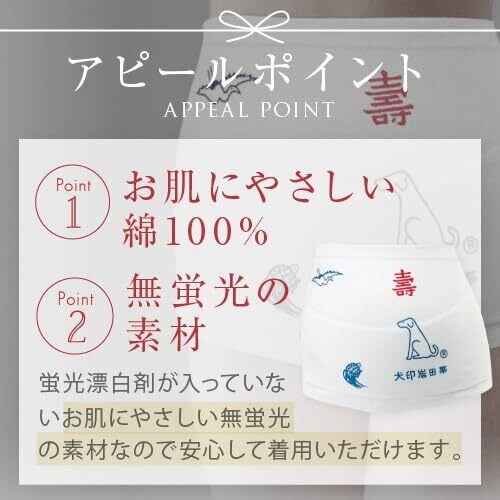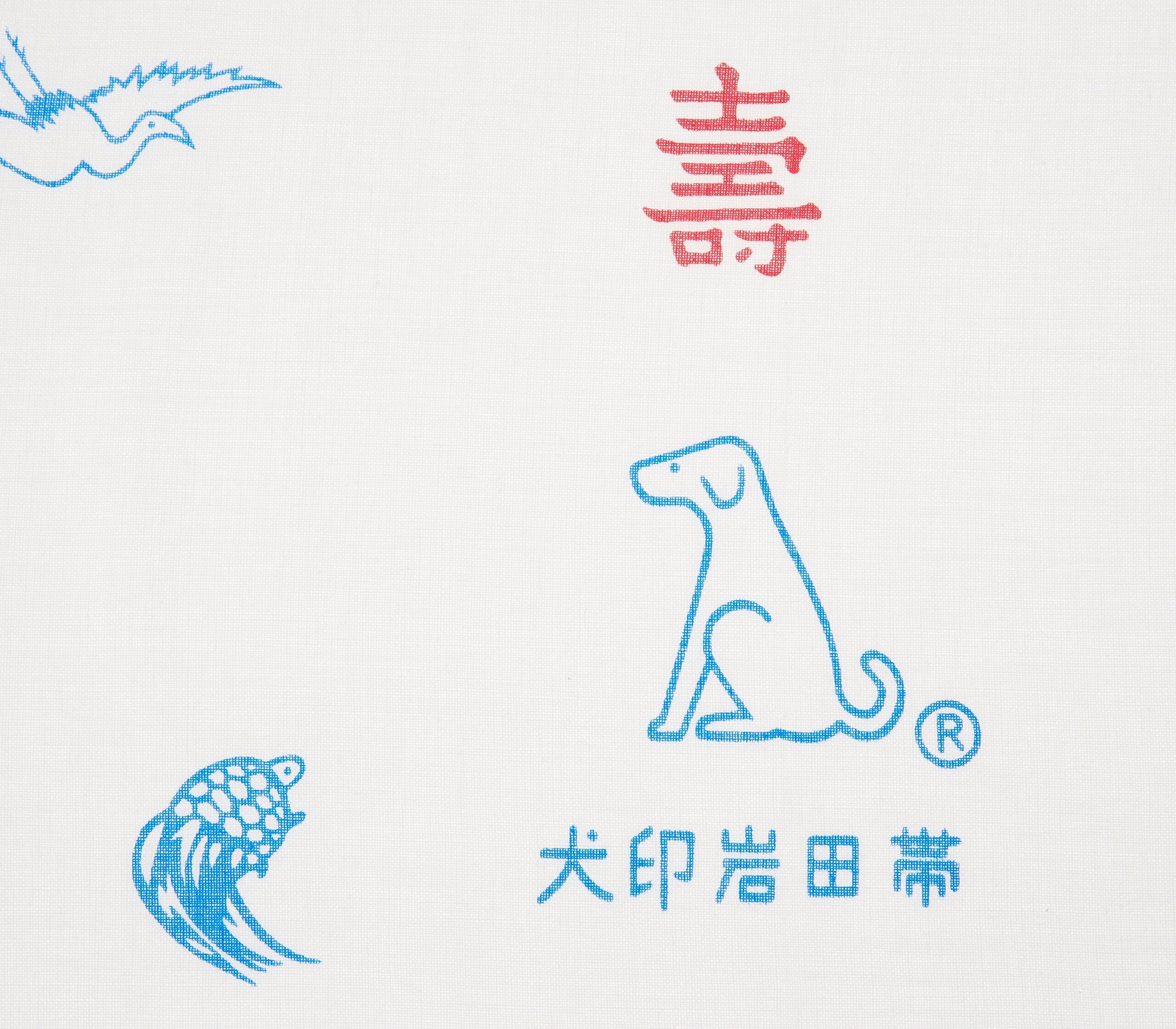 吸汗性の良い綿100%さらしで安産を願って、安産の象徴である犬と縁起の良い鶴・亀・寿のプリントを配しています。妊娠5か月目の戌の日の帯祝いにも最適