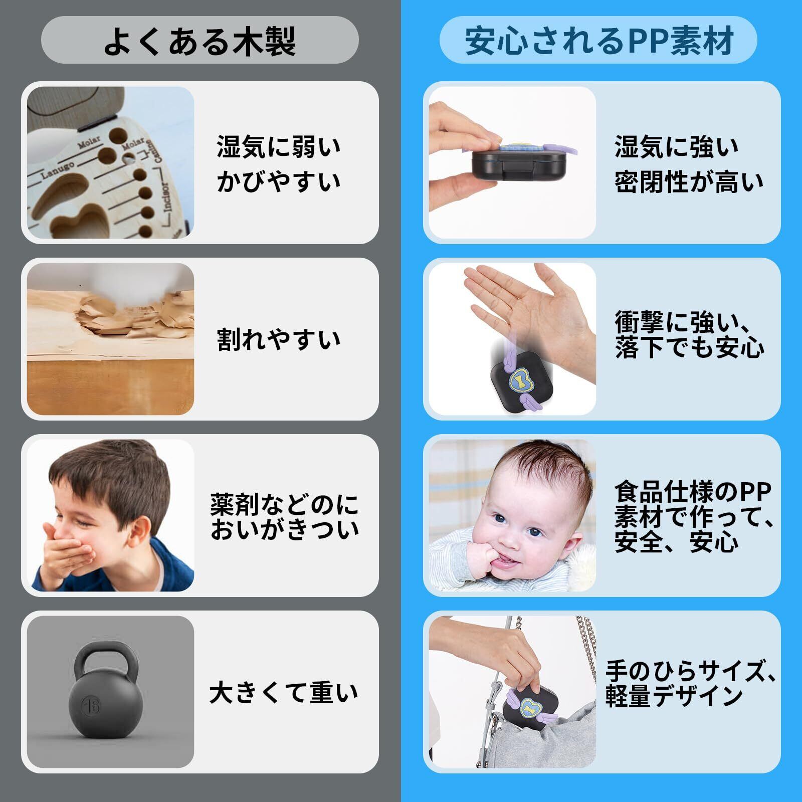 【安心される素材】食品仕様のPP素材で作っており、木製乳歯ケースにありがちなカビ等の心配がありません。耐久性に優れていて劣化しにくいので、長期間安心して保管できます。