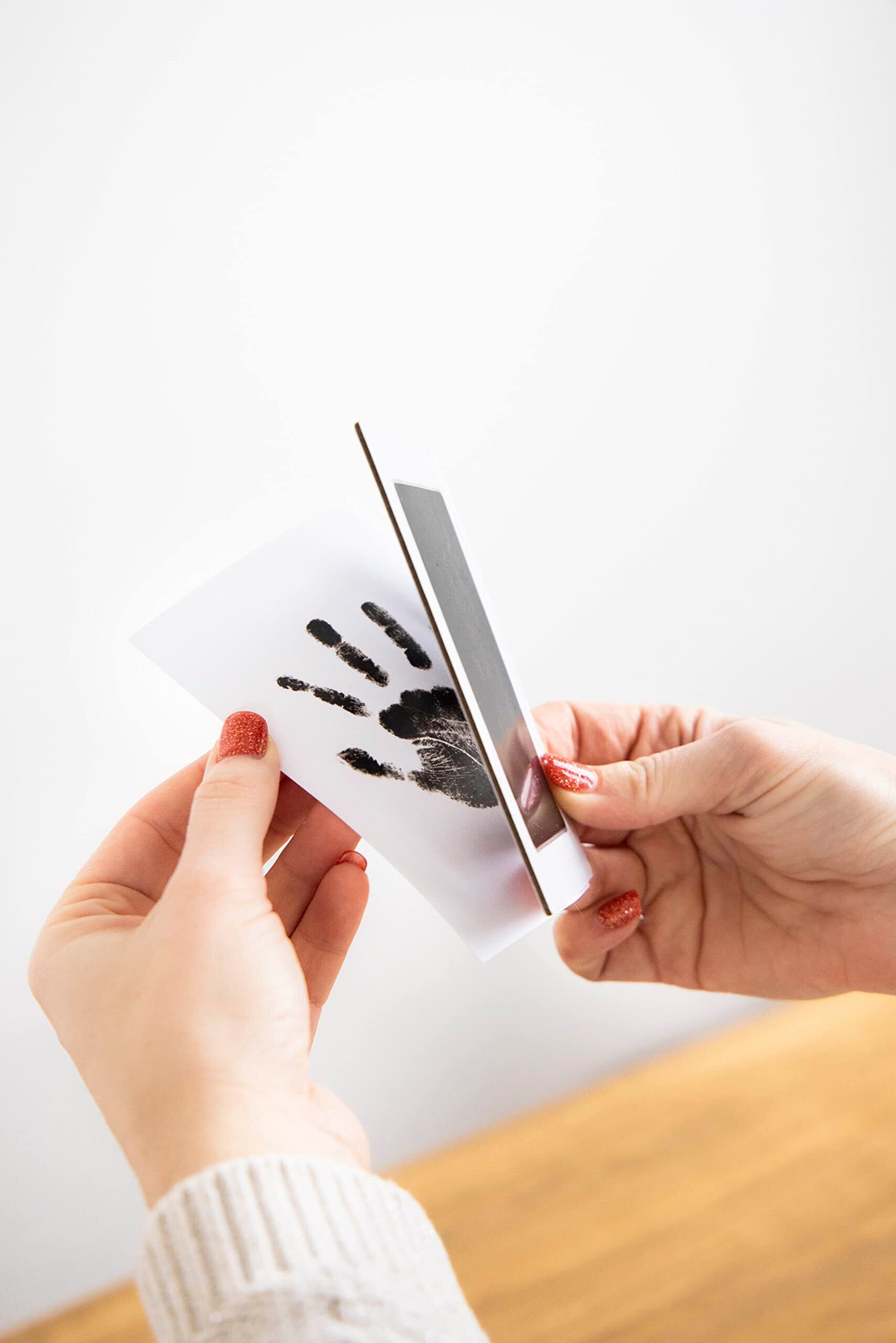 【形取りかんたん】 手や足を付属のインクパッドに当てて押すだけで、インクをつけずに手形足形が取れるので、簡単かつ汚れず衛生的です。