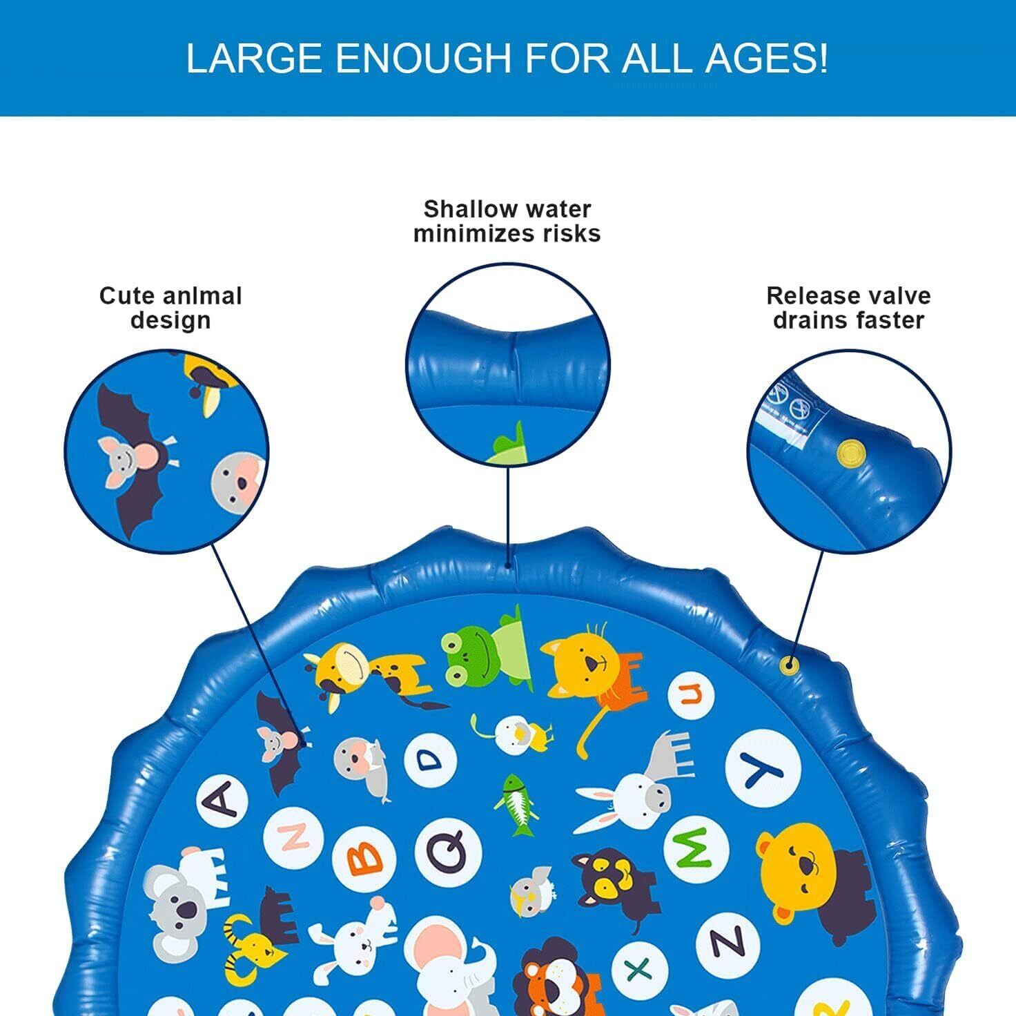 【可愛いプレイマット:】26の英字と多く動物からなるプレイマットはとても可愛いです。素敵な配色と可愛いデザイン、子供中に人気があります。子供たちは遊びながら簡単に学べ、子供の想像力を育てることができます。また、子供の遊びだけでなく、暑い日に、ペットちゃんも嬉しく遊べます。※ご注意:水を噴出し続けるためには、蛇口の水は出し続ける必要があります。
