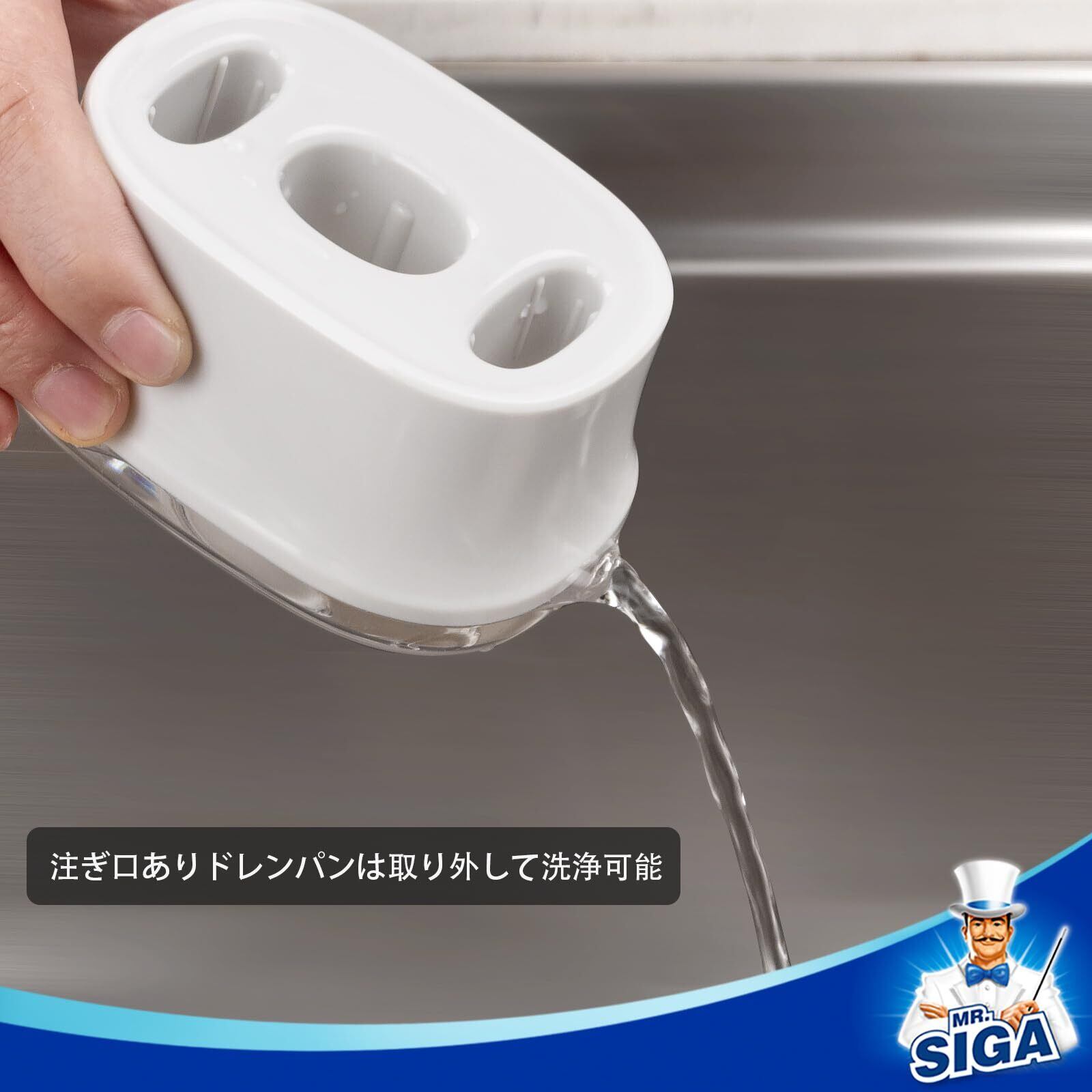 取り外し可能なホルダーには簡単排水とクリーニングのための注ぎ口が付いています。掃除用ブラシを整理整頓し、手の届きやすいところに置いておくことができます。 また、ブラシの毛から水滴を集め、カウンタートップをきれいに保ちます。