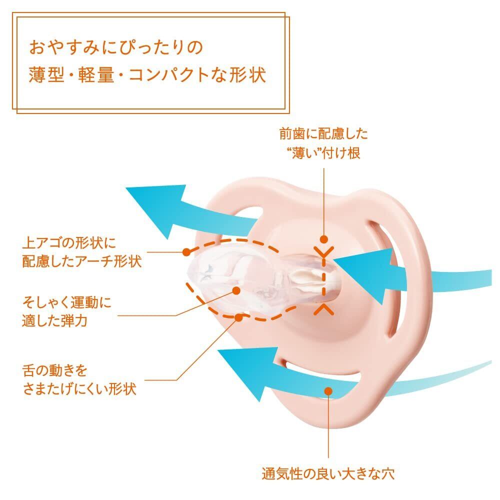 ●日本の赤ちゃんのお口の研究から生まれたおしゃぶりは、通気性を高める3つの穴で快適さにもこだわりました。