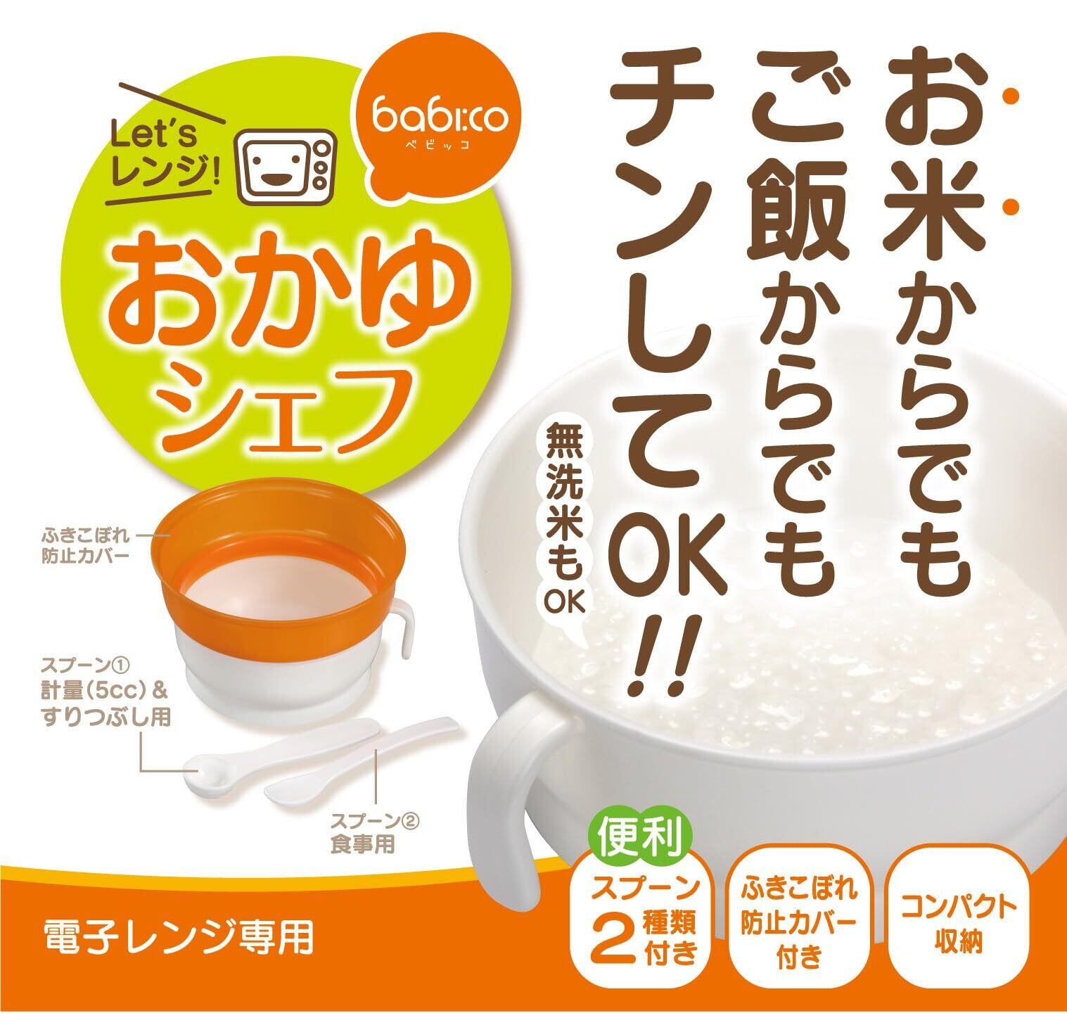 「お米」からでも「ごはん」からでも電子レンジでおかゆがつくれます。 【付属品】 ・計量スプーン ・フィーディングスプーン付