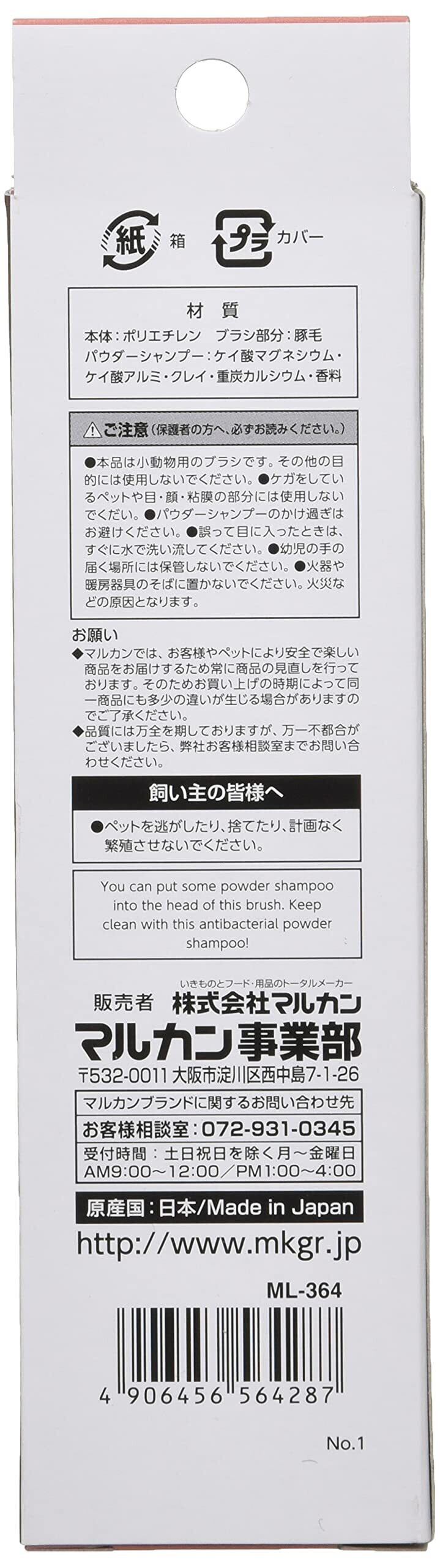 ●本品は小動物用のブラシです。その他の目的には使用しないでください。 ●ケガをしているペットや目・顔・粘膜の部分には使用しないでくだい。 ●パウダーシャンプーのかけ過ぎはお避けください。 ●誤って目に入ったときは、すぐに水で洗い流してください。 ●幼児の手の届く場所には保管しないでください。 ●火器や暖房器具のそばに置かないでください。火災などの原因となります。